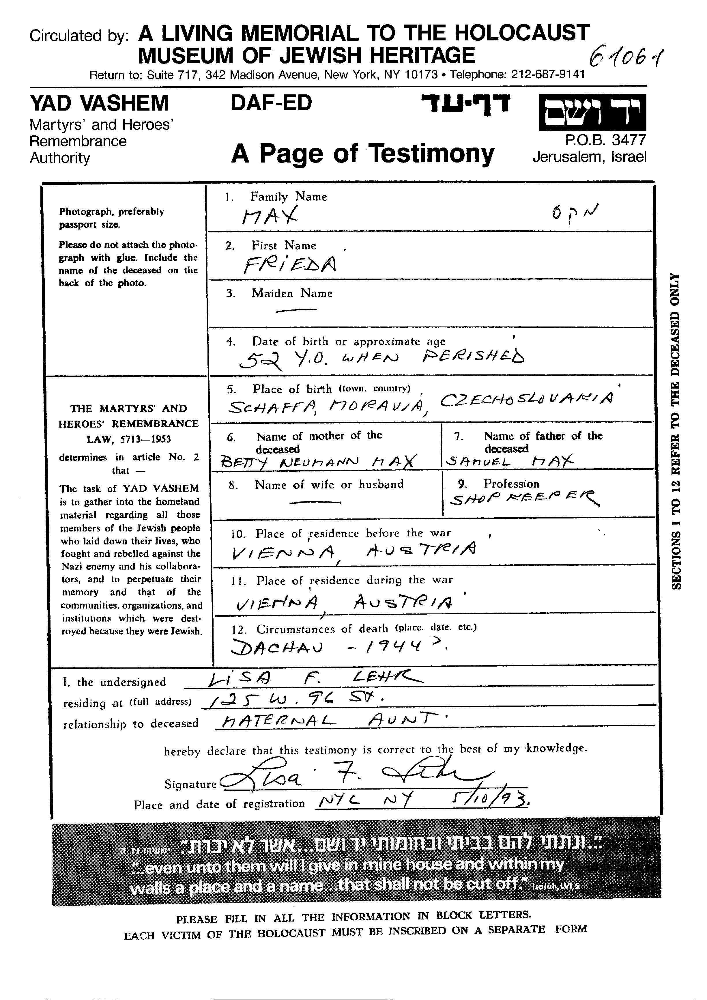 Frieda Max wurde in Schaffa, Tschechoslowakei geboren. Sie war die Tochter von Samuel und Betty, geb. Neumann. Sie war Ladenbesitzer/-in. Vor dem Zweiten Weltkrieg lebte sie in Wien, Österreich. Während des Krieges war sie in Wien, Österreich.