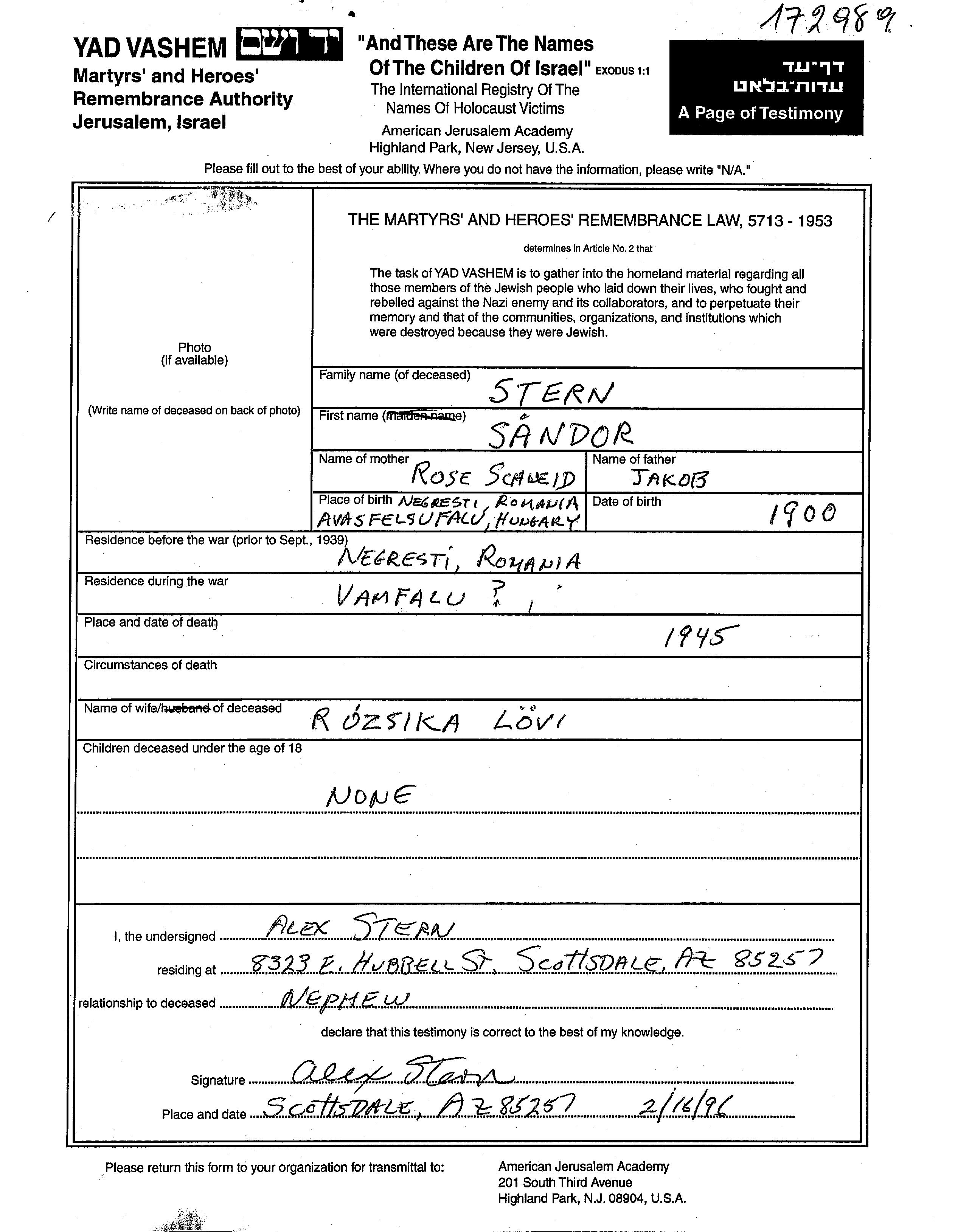 Sandor Stern wurde im Jahr 1900 in Negresti, Rumänien geboren. Vor dem Zweiten Weltkrieg lebte er in Vama, Rumänien.