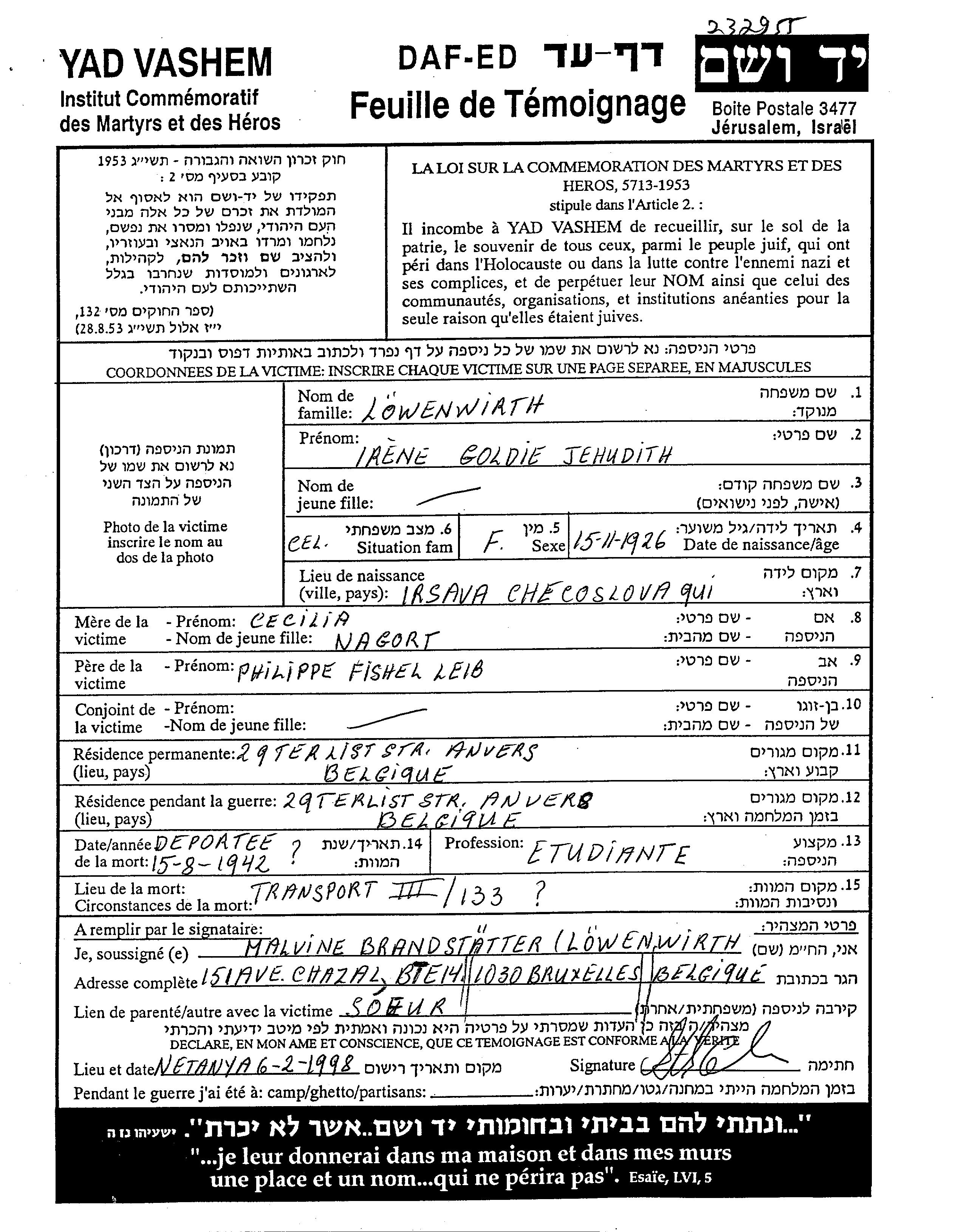 Lowenwirth | Irena | 1926 | Irsava, Tschechoslowakei | Liste von Deportierten |