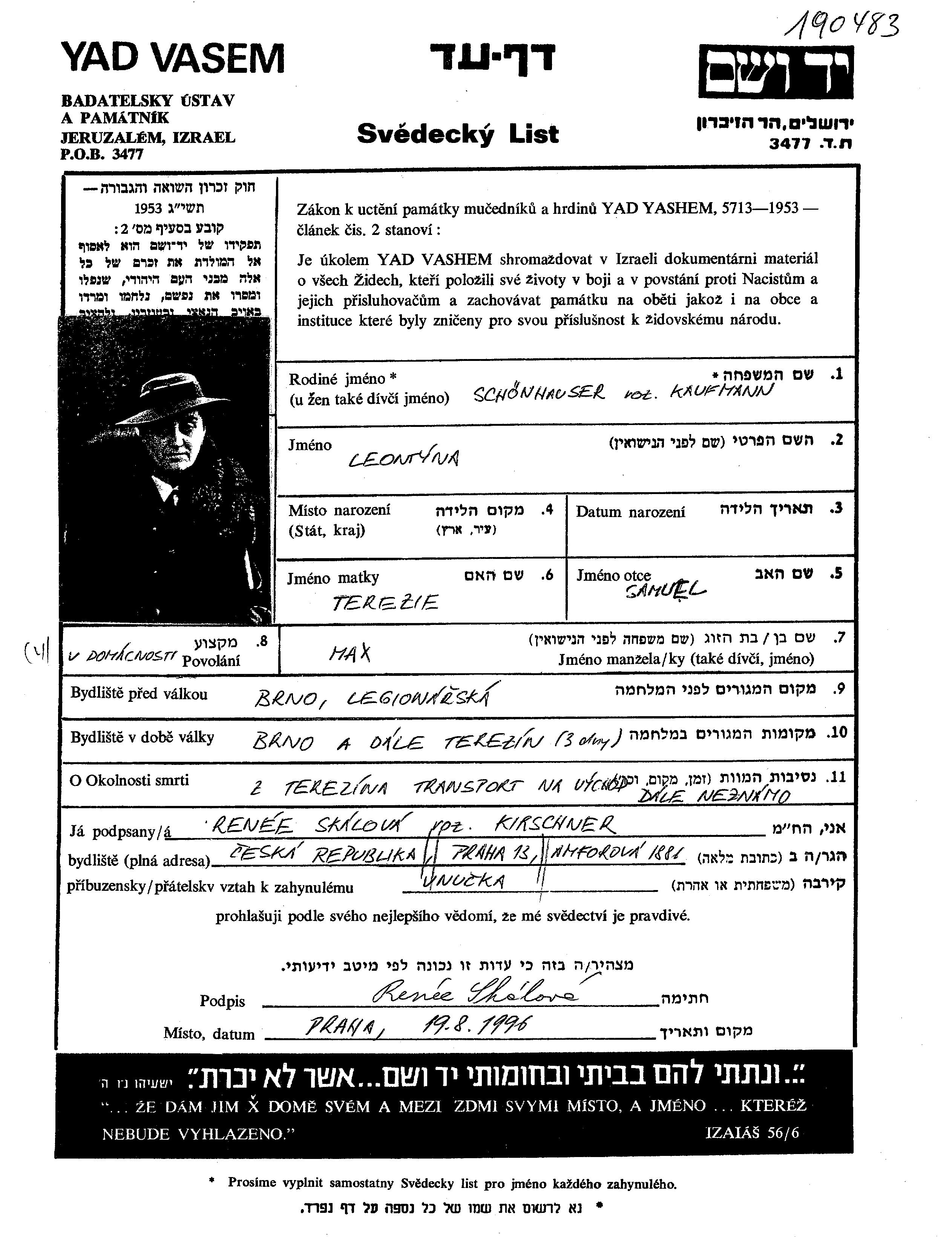 Leontyna Schönhauser, geb. Kaufmann. Sie war Hausfrau. Vor dem Zweiten Weltkrieg lebte sie in Brno, Tschechoslowakei.