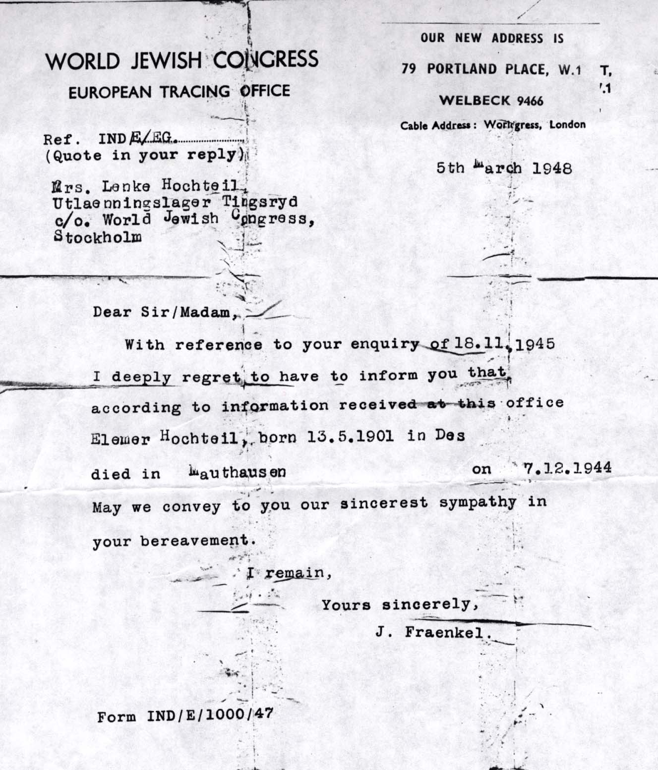 Elemer Hochteil wurde im Jahr 1901 in Dej, Rumänien geboren. Er war Textilhändler/-in. Vor dem Zweiten Weltkrieg lebte er in Oradea, Rumänien.