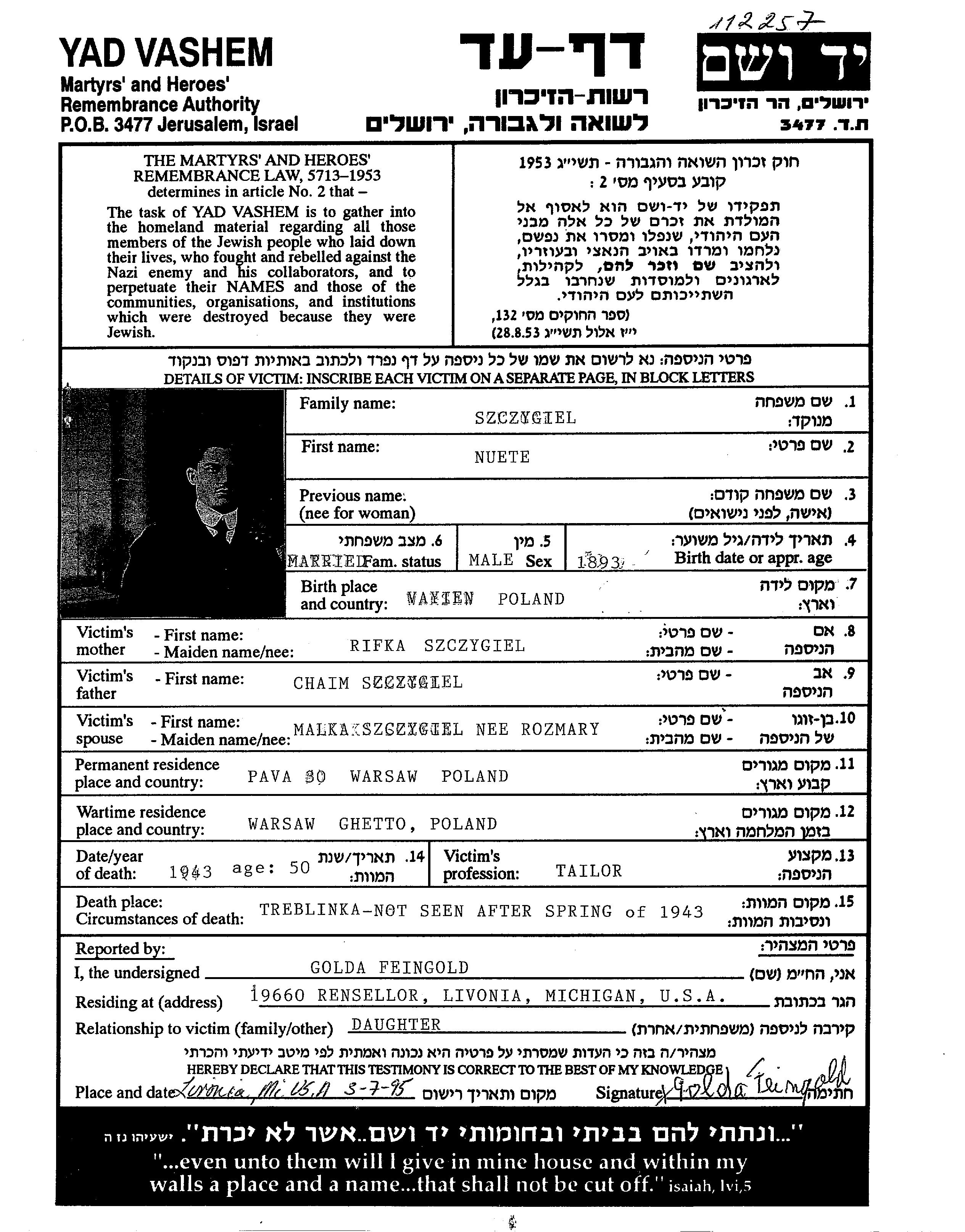 Nuete Szczygiel wurde im Jahr 1893 in Undeciphered Place, Polen geboren. Er war Schneider. Vor dem Zweiten Weltkrieg lebte er in Warszawa, Polen.