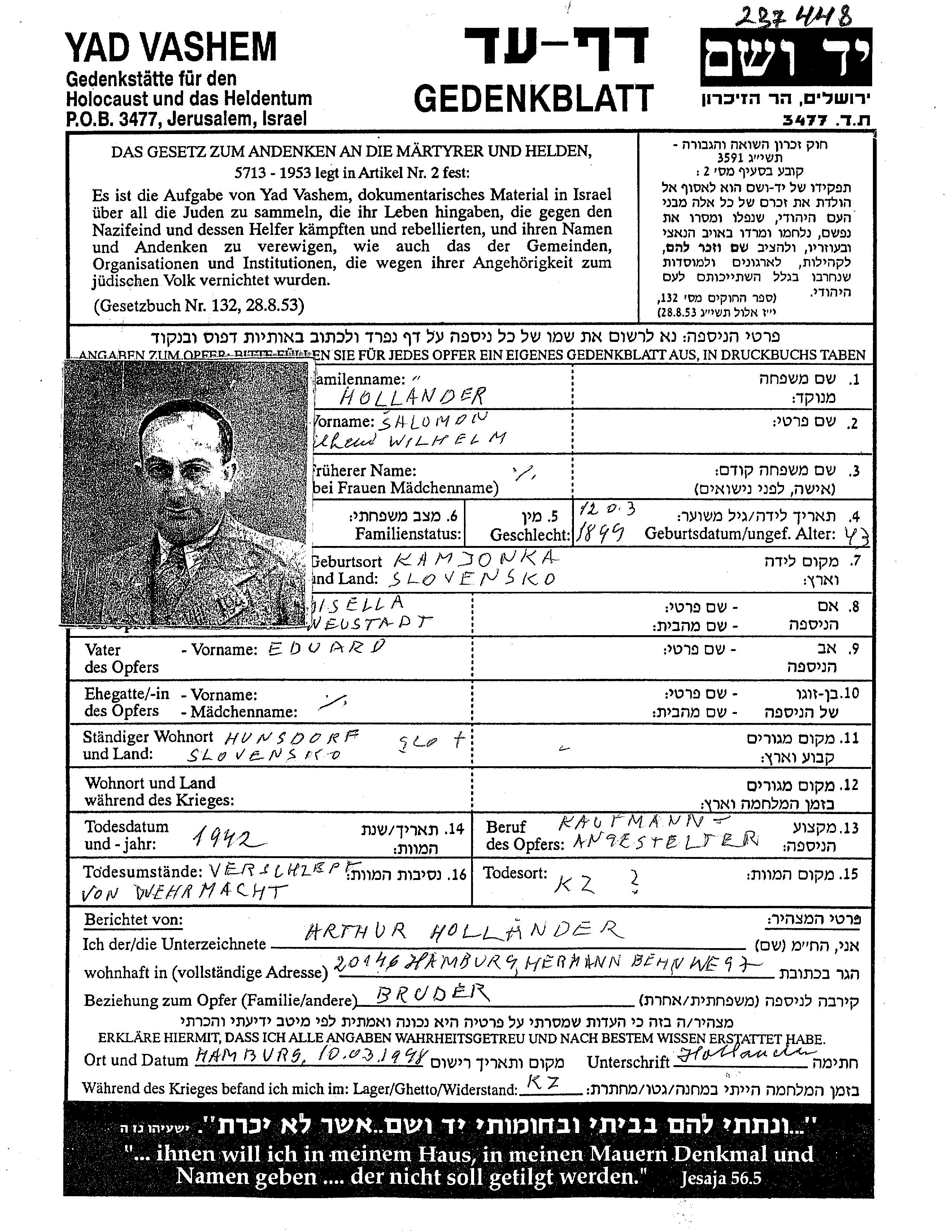 Salomon Wilhelm Holländer wurde im Jahr 1899 in Kamienska, Tschechoslowakei geboren. Er war Kaufmann/-frau. Vor dem Zweiten Weltkrieg lebte er in Huncovce, Tschechoslowakei.