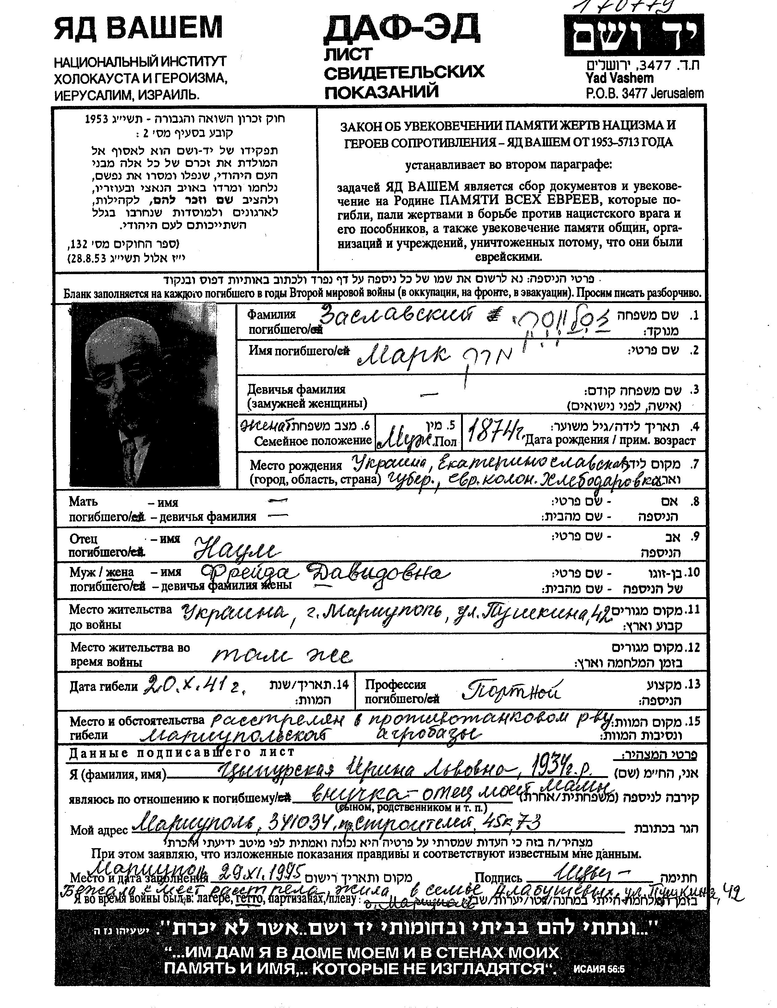 Mark Zaslavski wurde im Jahr 1874 in Khlebodarovka, Ukraine (UdSSR) geboren. Er war Schneider. Vor dem Zweiten Weltkrieg lebte er in Mariupol, Ukraine (UdSSR). Mark wurde in der Schoah ermordet. Todesort: Mariupol, Ukraine (UdSSR) im Jahr 20/10/1941.