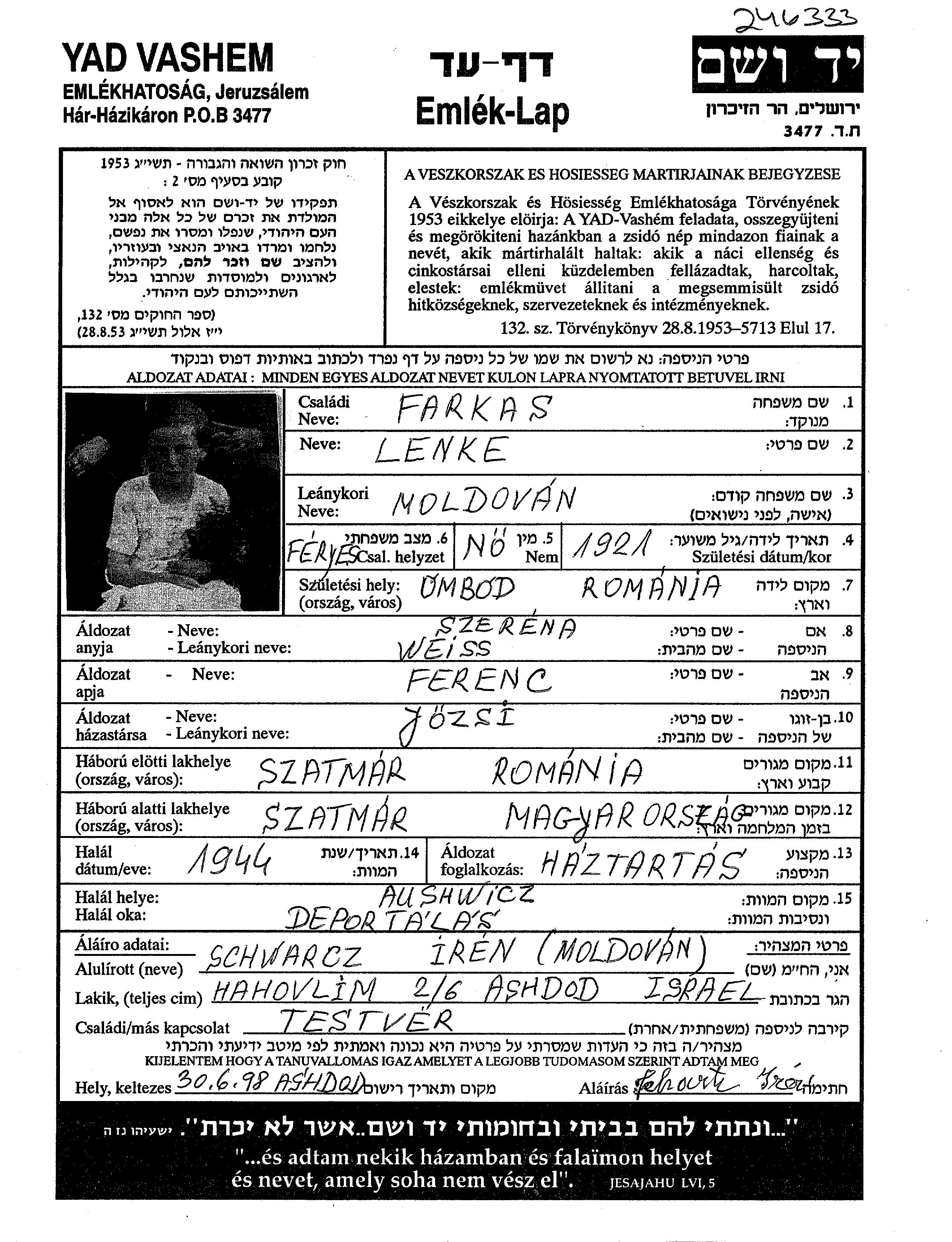 Lenke Farkas, geb. Moldovan wurde im Jahr 1921 in Ambud, Rumänien geboren. Vor dem Zweiten Weltkrieg lebte sie in Satu Mare, Rumänien.