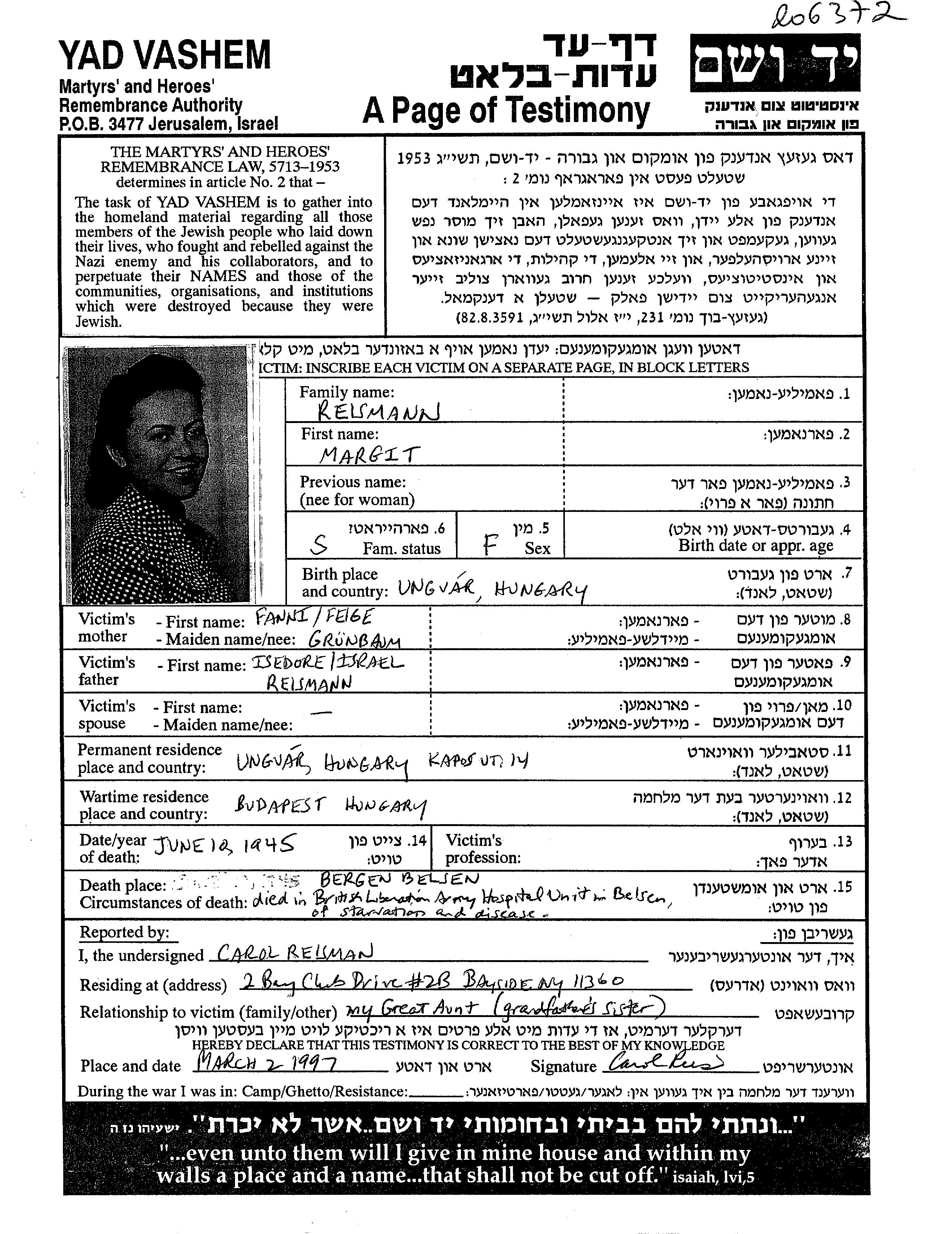 Margit wurde in der Schoah ermordet. Todesort: Bergen Belsen, Deutsches Reich im Jahr 10/06/1945.