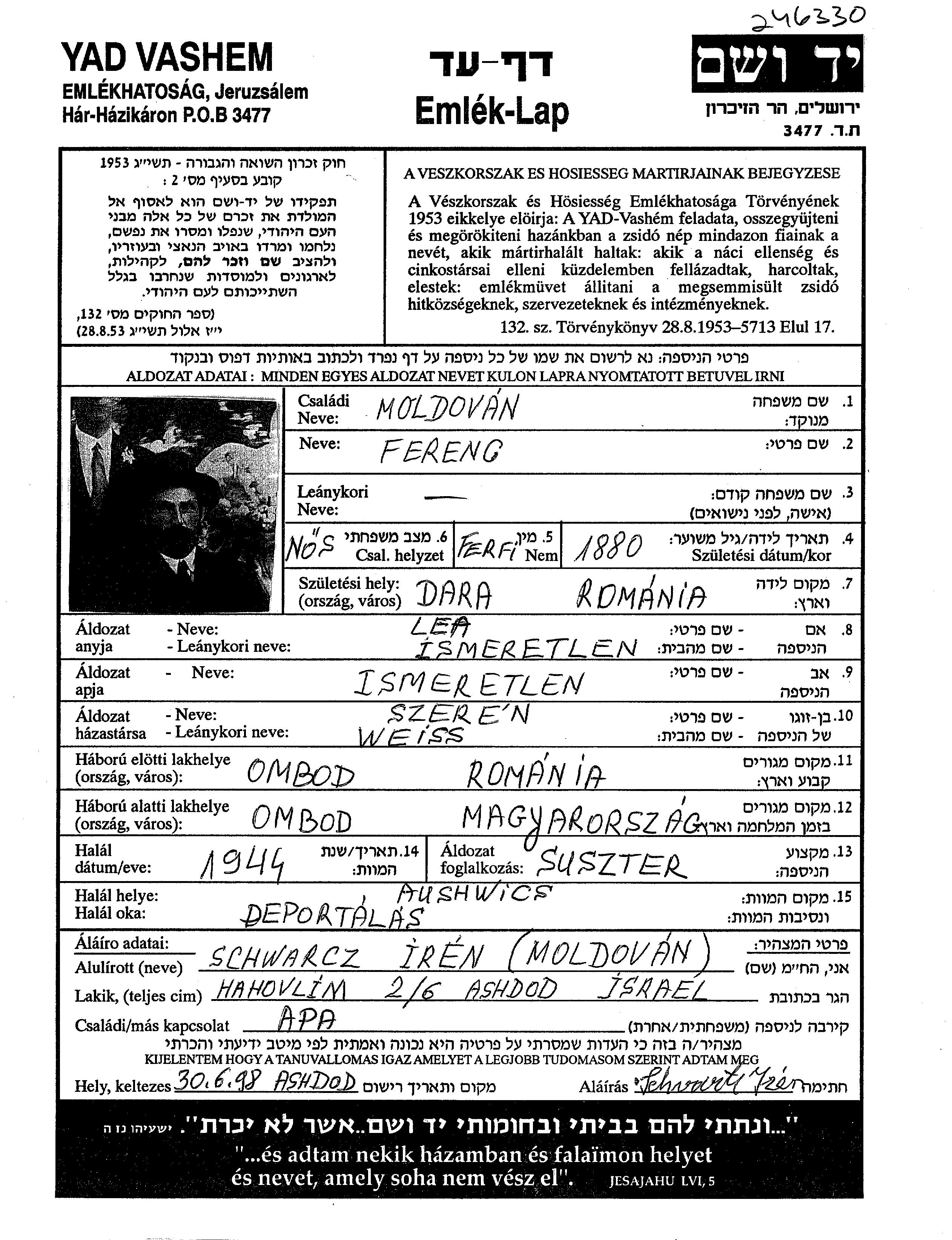 Ferentz Moldovan wurde im Jahr 1880 in Dara, Rumänien geboren. Vor dem Zweiten Weltkrieg lebte er in Ambud, Rumänien.