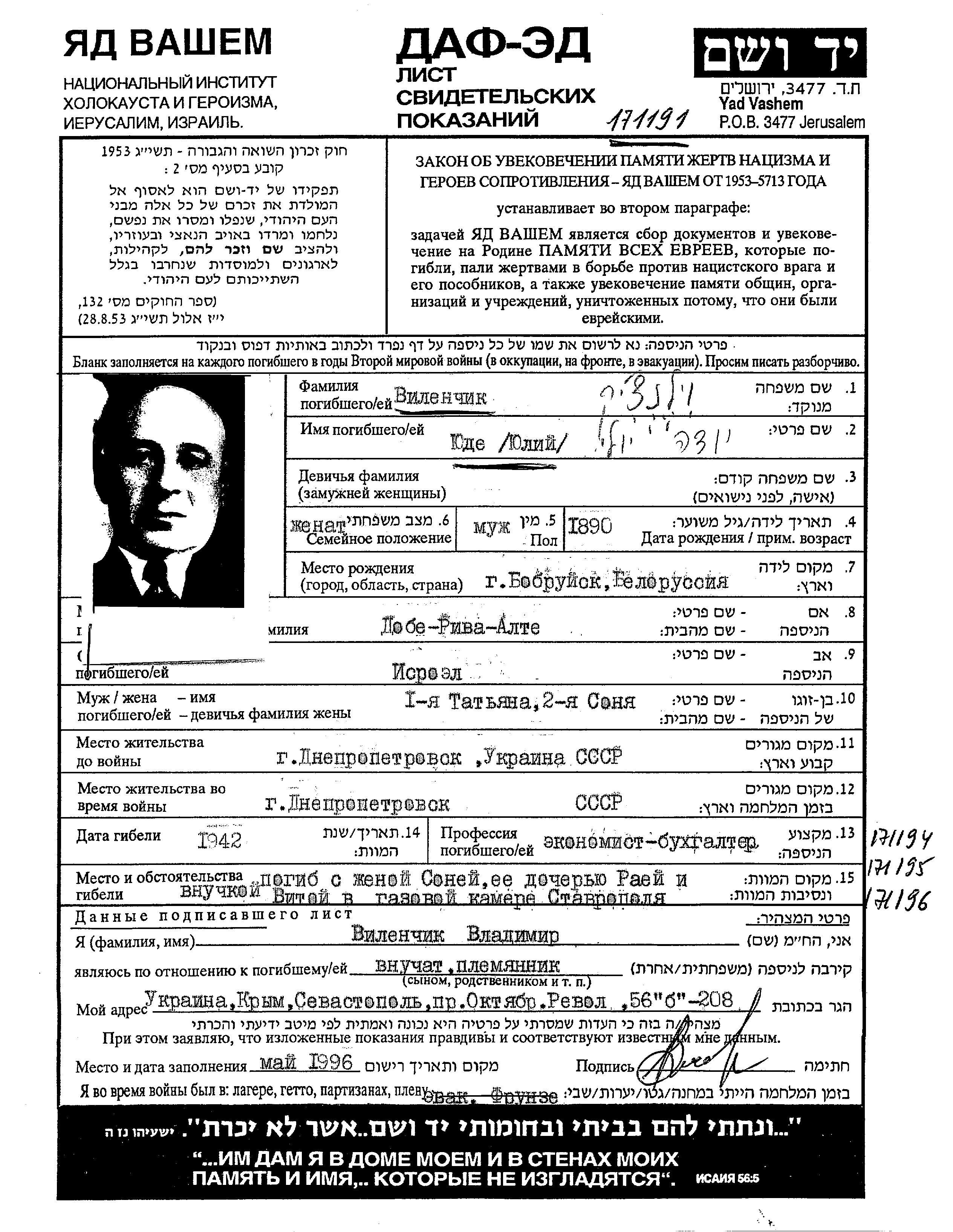 Yude Yuli Vilenchik wurde im Jahr 1890 in Bobruysk, Weißrussland (UdSSR) geboren. Er war Ökonom/-in. Vor dem Zweiten Weltkrieg lebte er in Dnepropetrovsk, Ukraine (UdSSR).