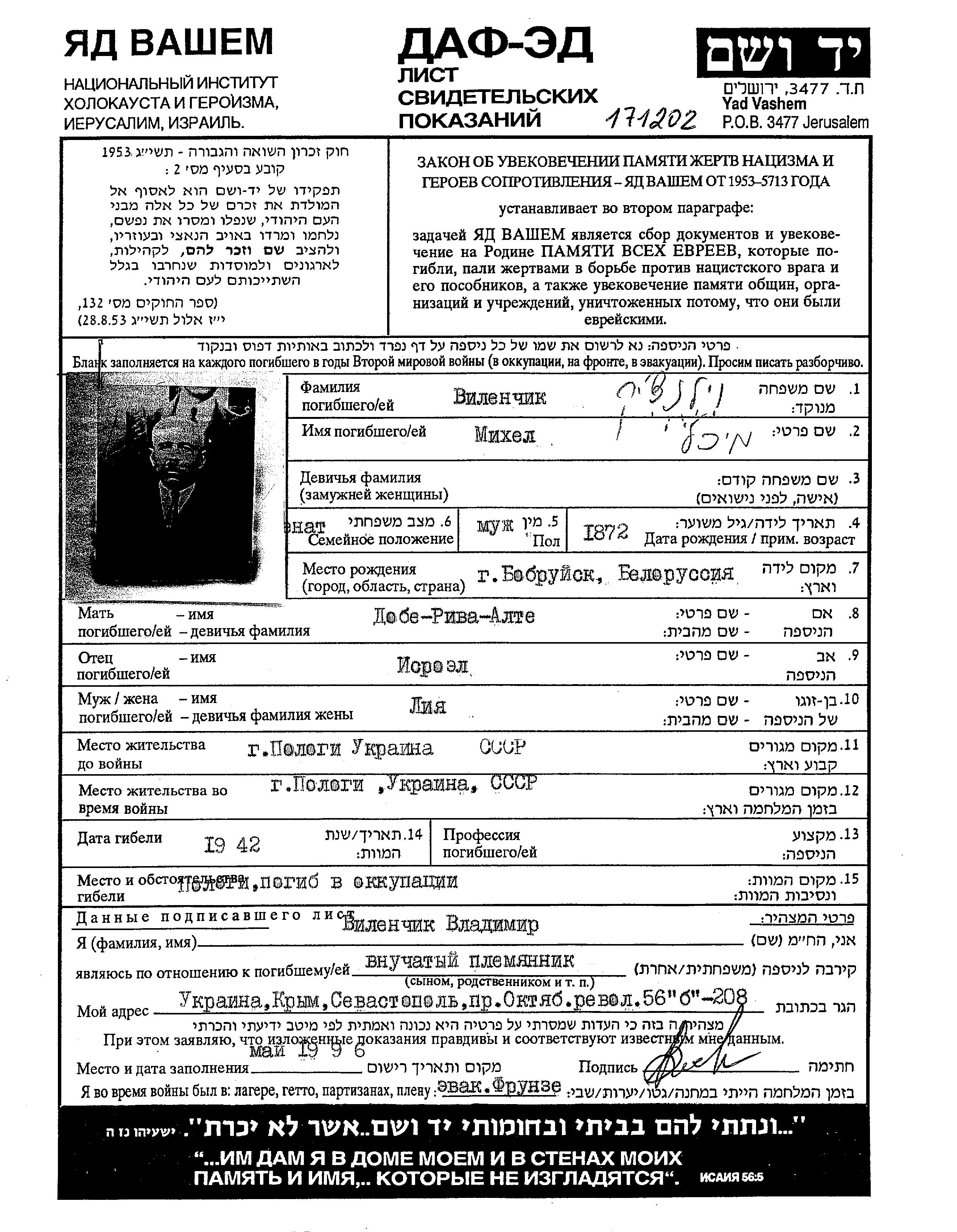 Mikhel Vilenchik wurde im Jahr 1872 in Bobruysk, Weißrussland (UdSSR) geboren. Vor dem Zweiten Weltkrieg lebte er in Pologi, Ukraine (UdSSR).