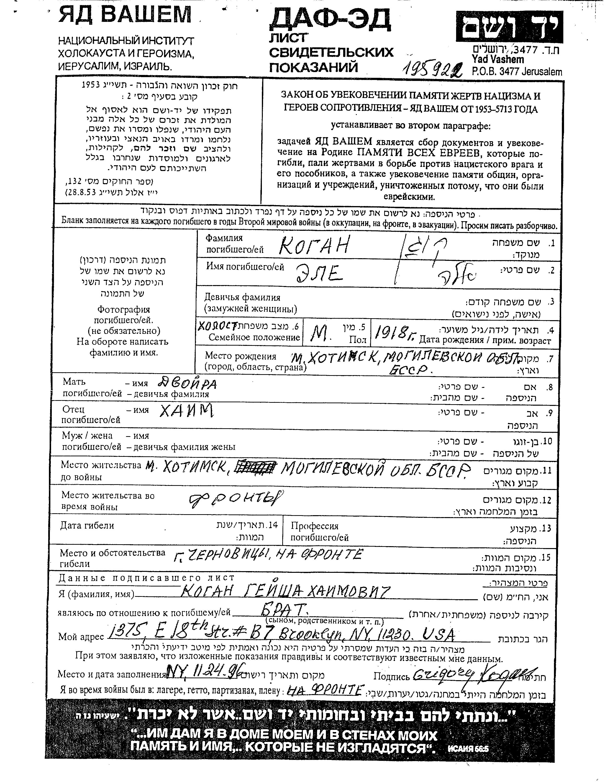Ele Ela Kogan wurde im Jahr 1918 in Khotimsk, Weißrussland (UdSSR) geboren. Vor dem Zweiten Weltkrieg lebte er in Khotimsk, Weißrussland (UdSSR).