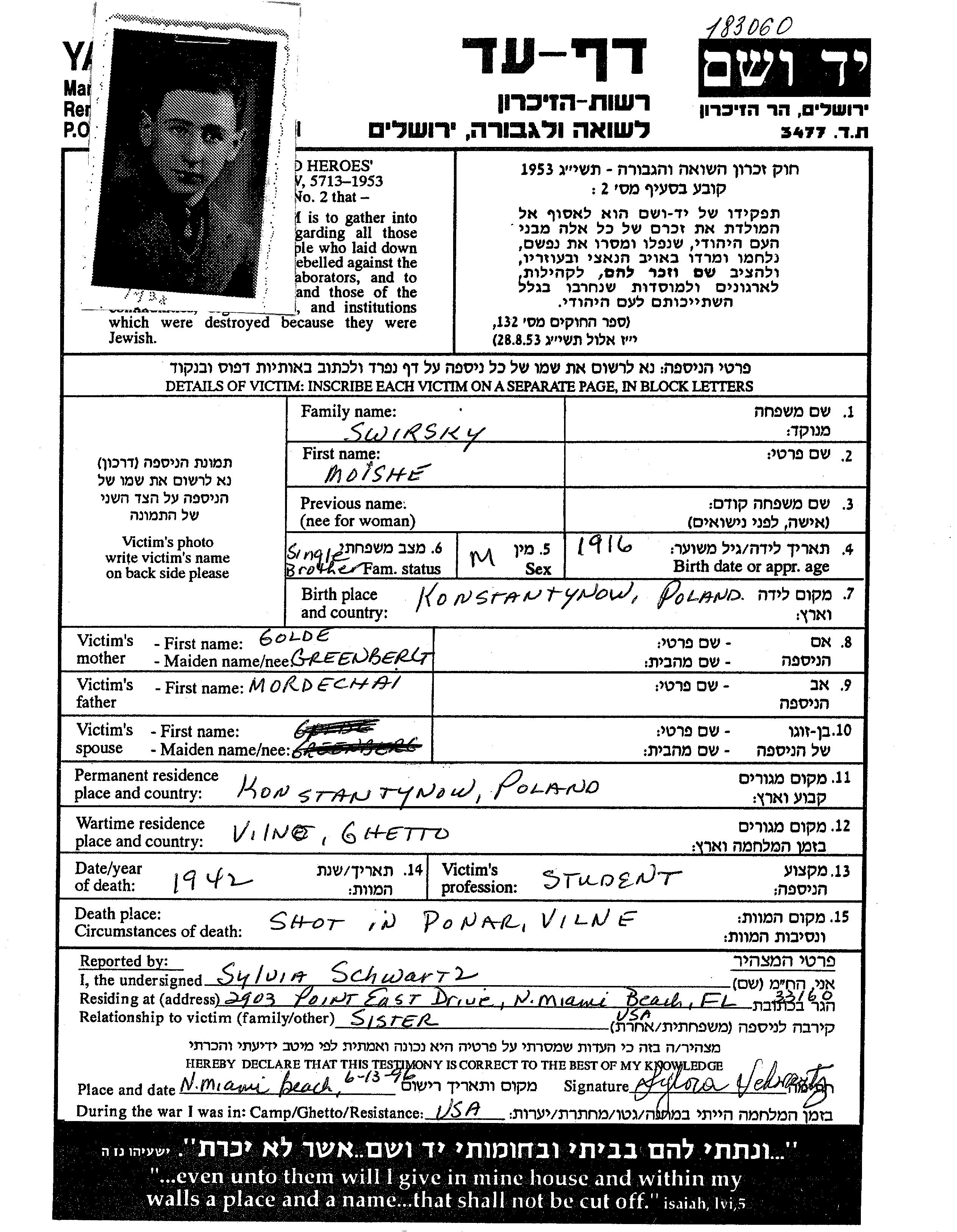 Moishe Swirsky wurde im Jahr 1916 in Konstantynow, Polen geboren. Er war Student. Vor dem Zweiten Weltkrieg lebte er in Konstantynow, Polen.