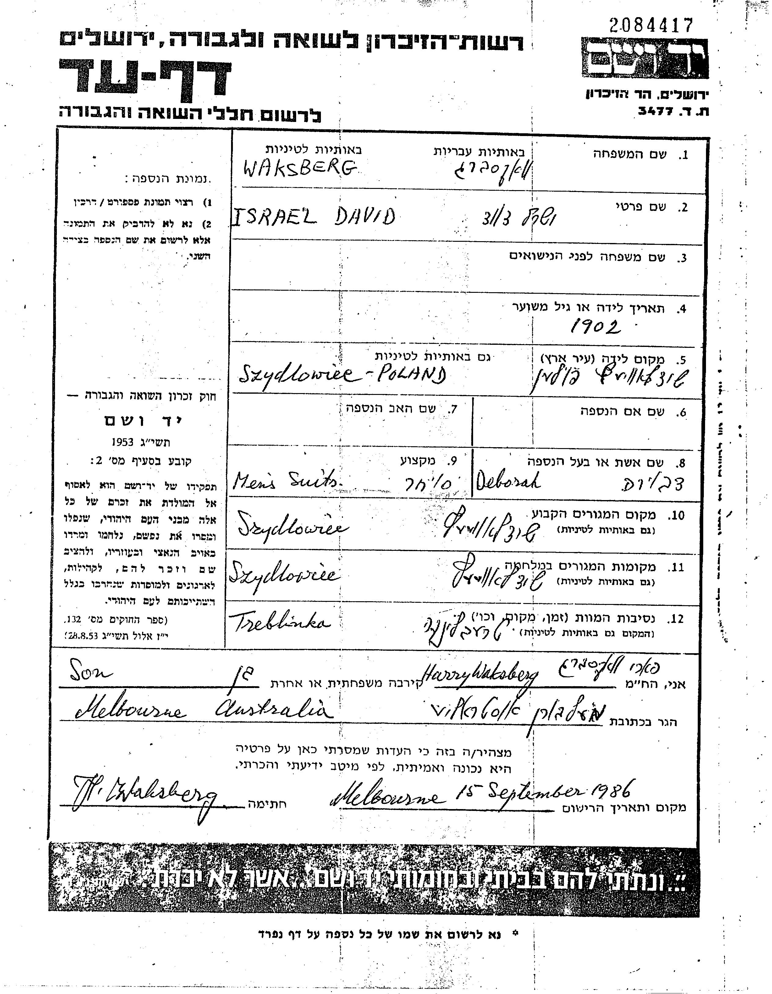 Israel David Waksberg wurde im Jahr 1902 in Szydlowiec, Polen geboren. Er war Kaufmann/-frau. Vor dem Zweiten Weltkrieg lebte er in Szydlowiec, Polen.