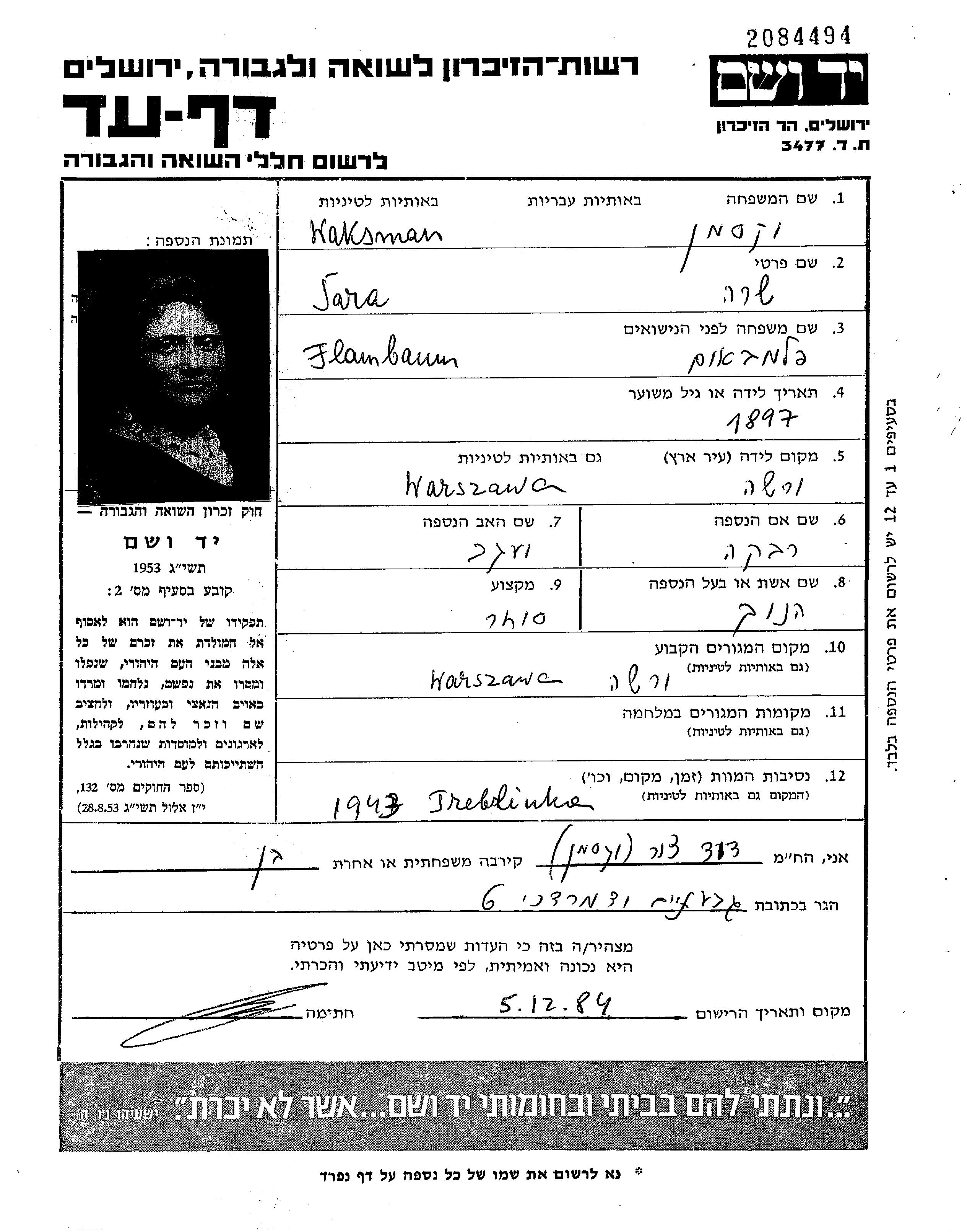 Sara Waksman, geb. Flambaum wurde im Jahr 1897 in Warszawa, Polen geboren. Sie war Kaufmann/-frau. Vor dem Zweiten Weltkrieg lebte sie in Warszawa, Polen.