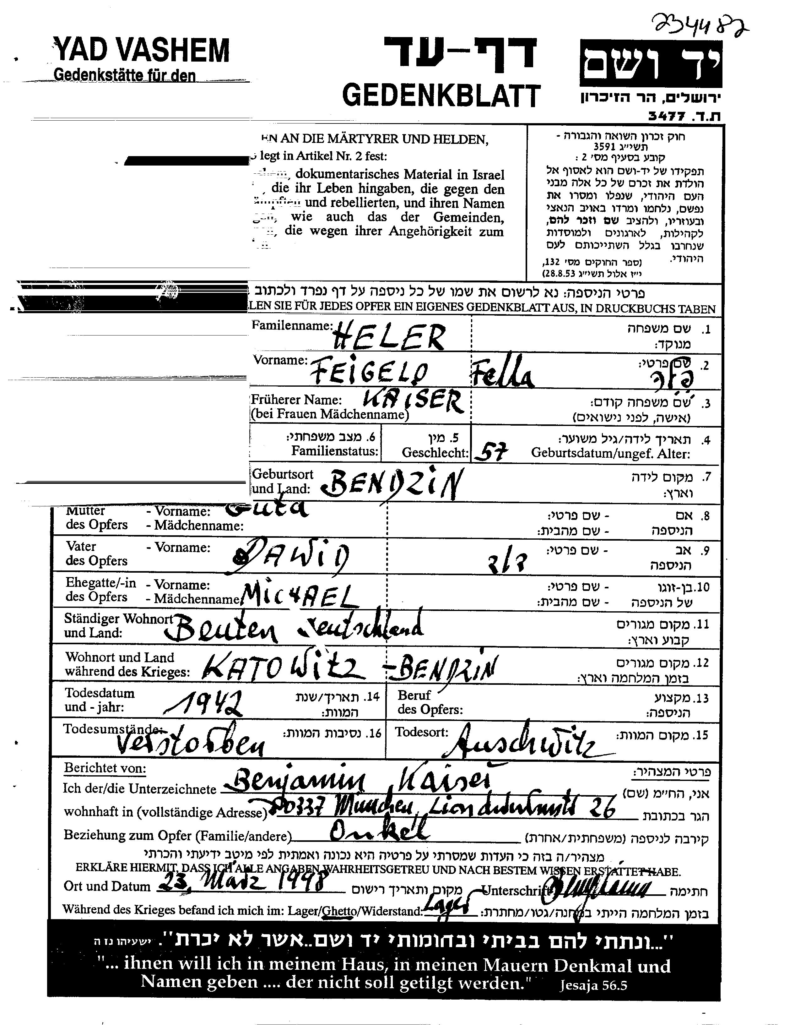 Feigelo Fella Heler, geb. Kaiser wurde in Będzin, Polen geboren. Vor dem Zweiten Weltkrieg lebte sie in Beuthen, Deutsches Reich.