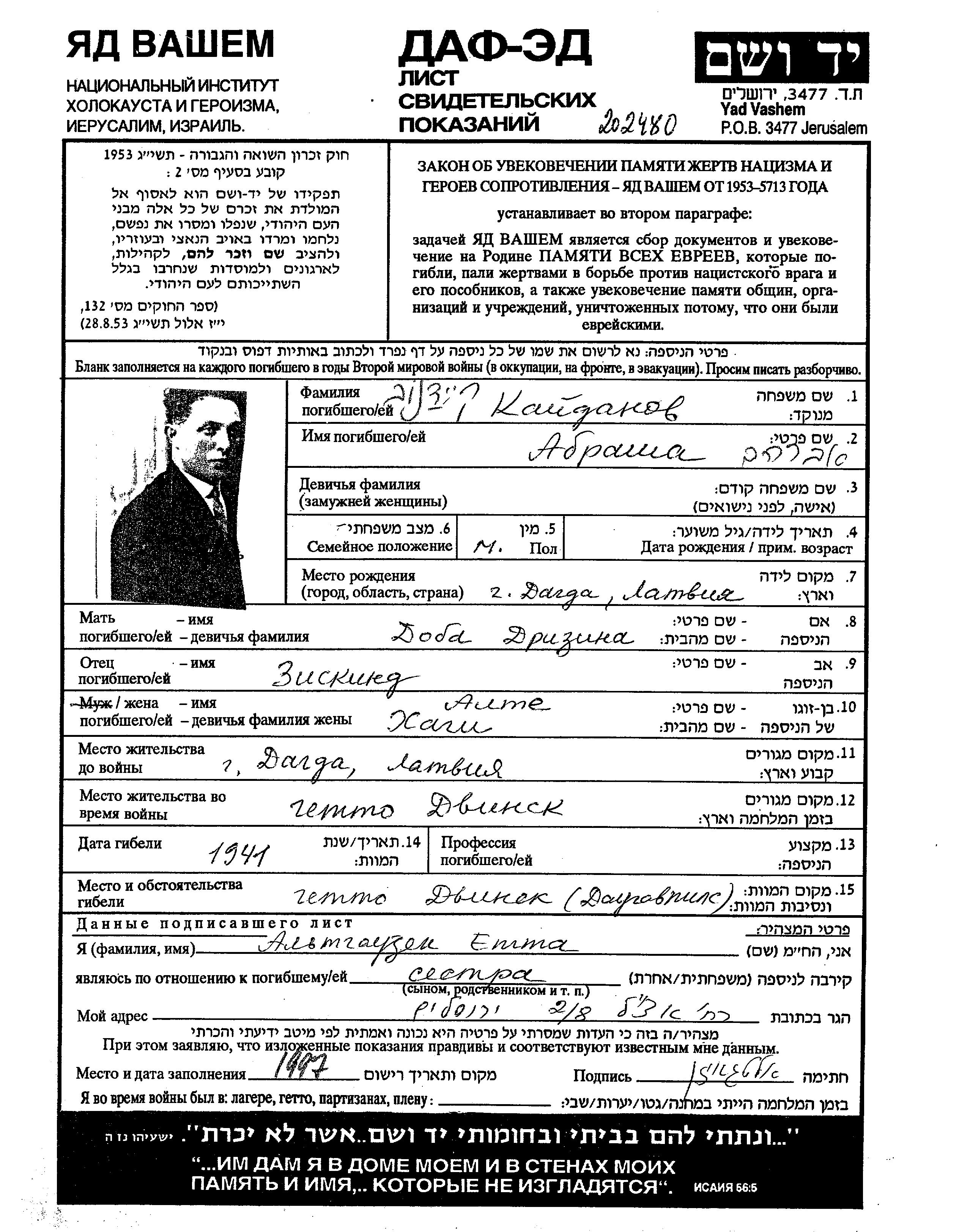 Abrasha Kaidanov wurde in Dagda, Lettland geboren. Vor dem Zweiten Weltkrieg lebte er in Dagda, Lettland.