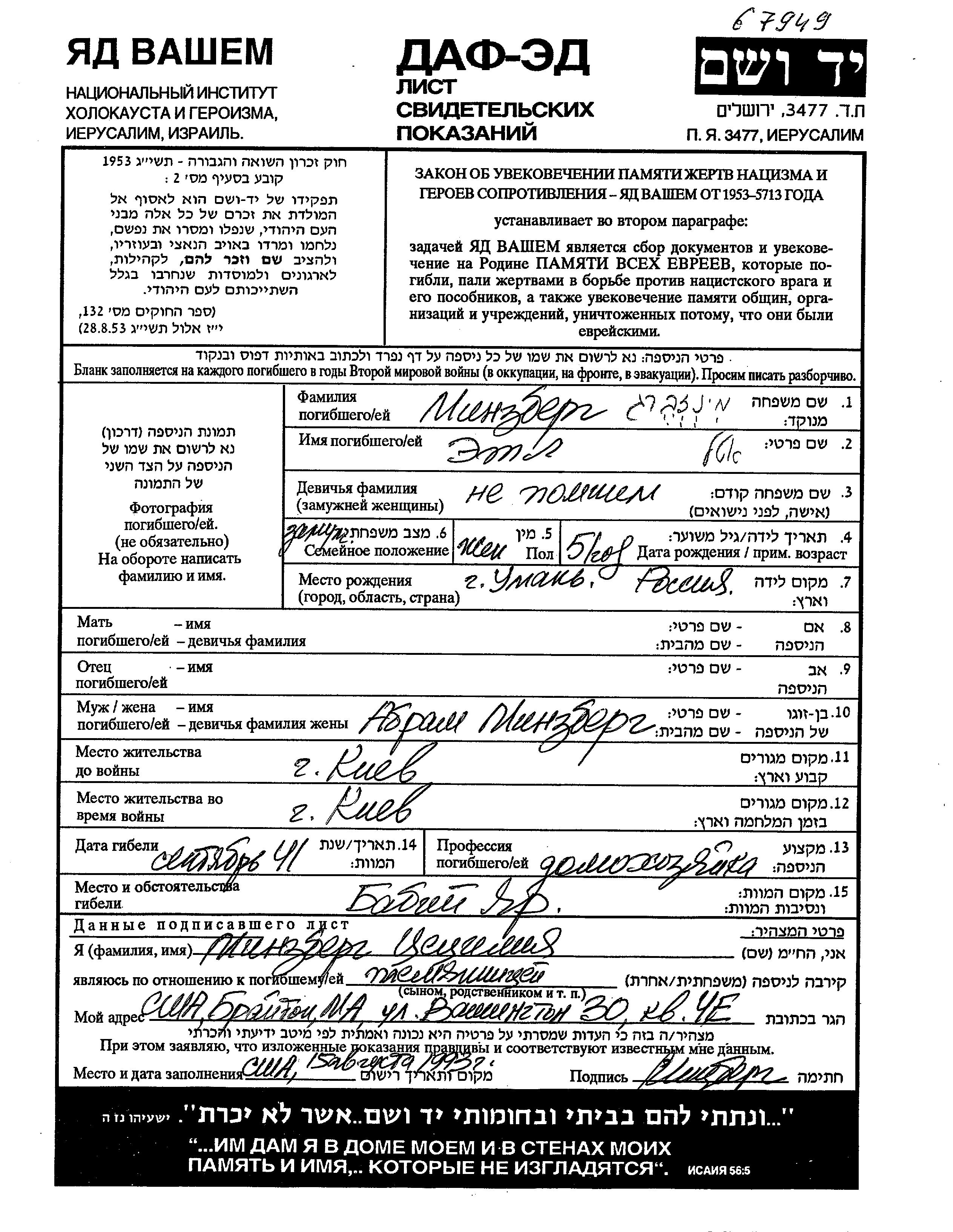 Etl Minzberg wurde im Jahr 1890 in Uman, Ukraine (UdSSR) geboren. Sie war Hausfrau und mit Abram Verheiratet. Vor dem Zweiten Weltkrieg lebte sie in Kiyev, Ukraine (UdSSR). Während des Krieges war sie in Kiyev, Ukraine (UdSSR).