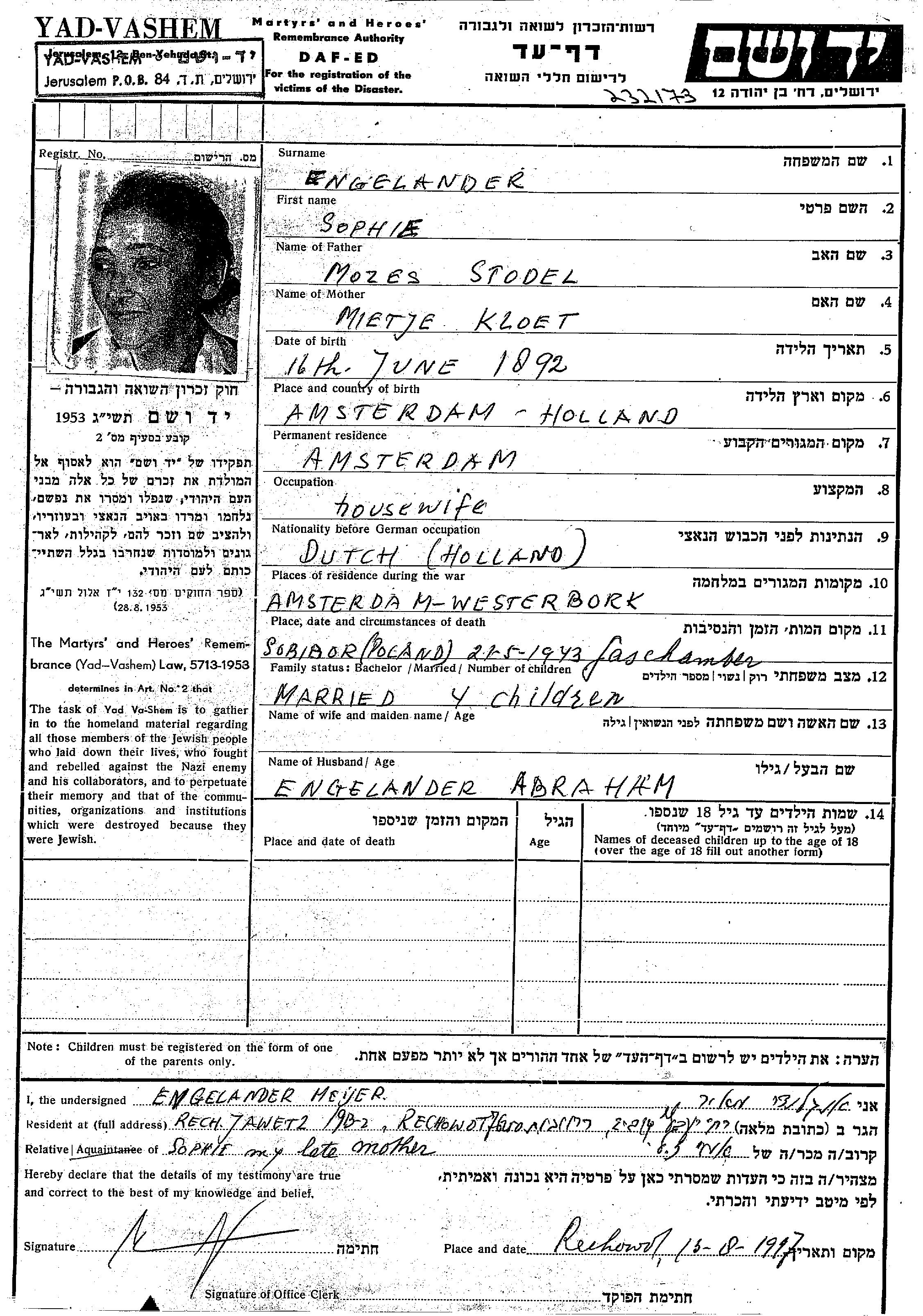 Sophie Engelander, geb. Stodel wurde im Jahr 1892 in Amsterdam, Niederlande geboren. Sie war Hausfrau. Vor dem Zweiten Weltkrieg lebte sie in Niederlande.