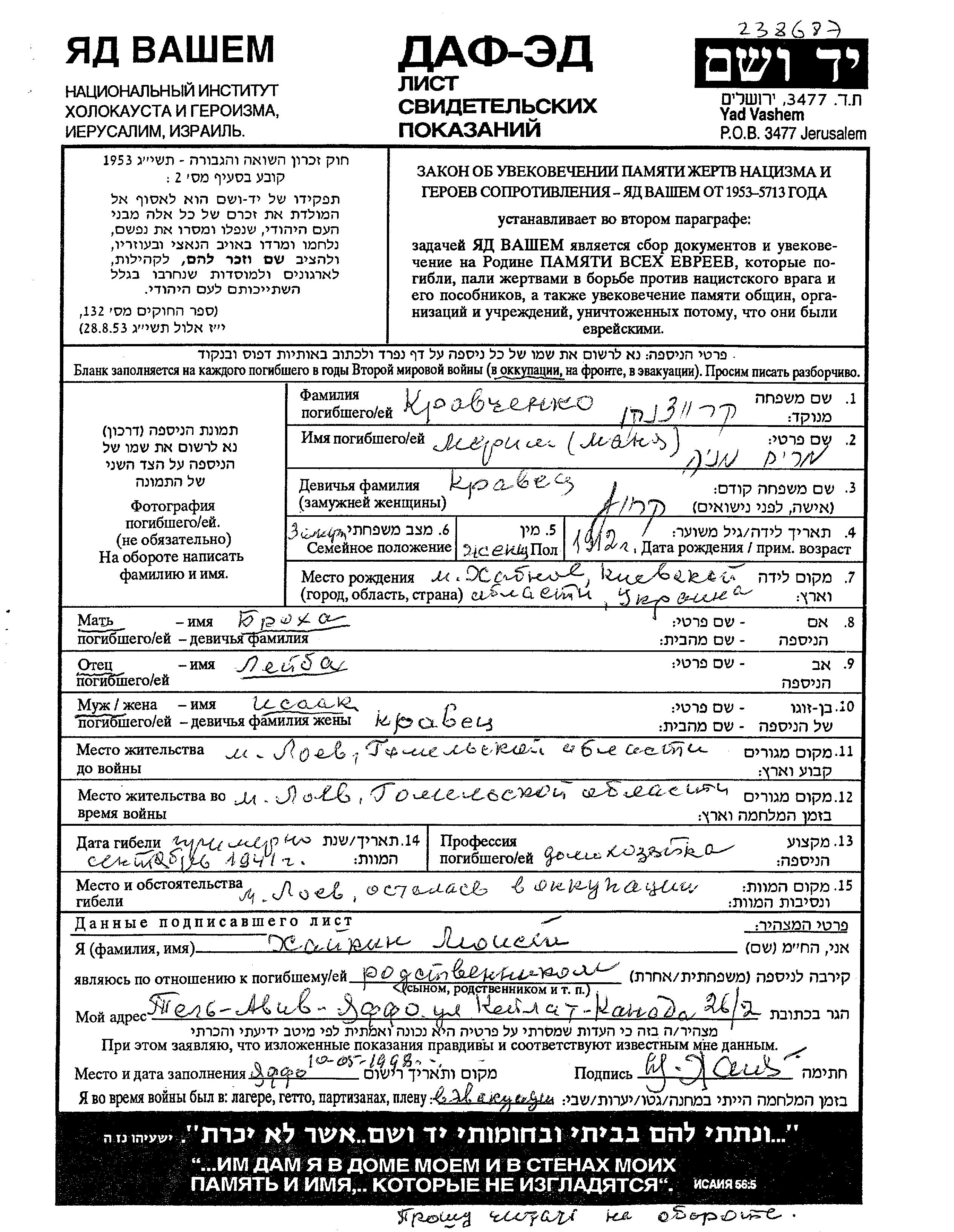 Kravchenko | Merim Manya Miriam | 1912 | Loyev, Weißrussland (UdSSR) | Gedenkblatt |