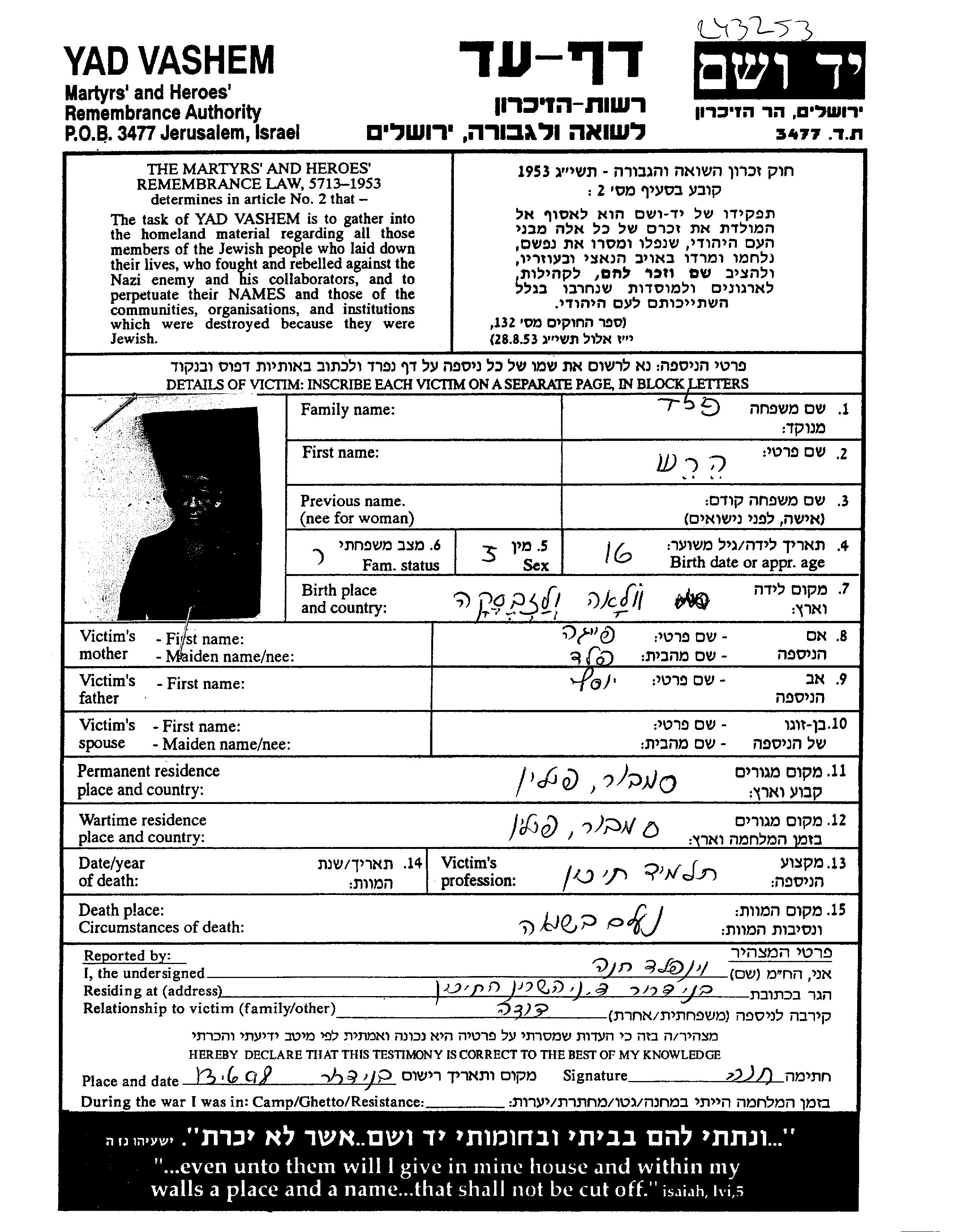Hersh Feld wurde in Wola Zglobienska, Polen geboren. Er war Schüler/-in. Vor dem Zweiten Weltkrieg lebte er in Sambor, Polen.