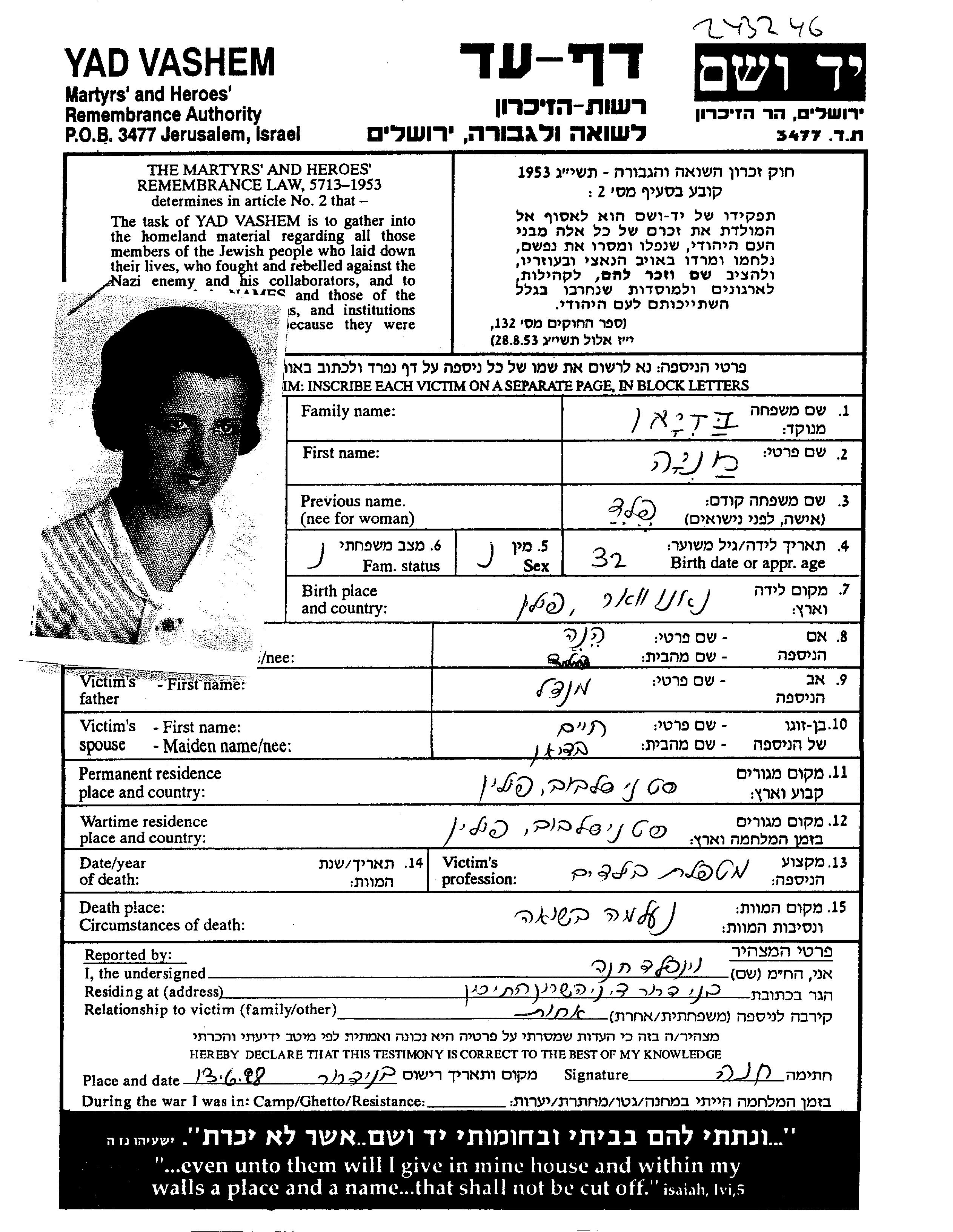 Mania Badian, geb. Feld wurde in Nanowa, Polen geboren. Sie war Kindergärtnerin. Vor dem Zweiten Weltkrieg lebte sie in Stanislawow, Polen.