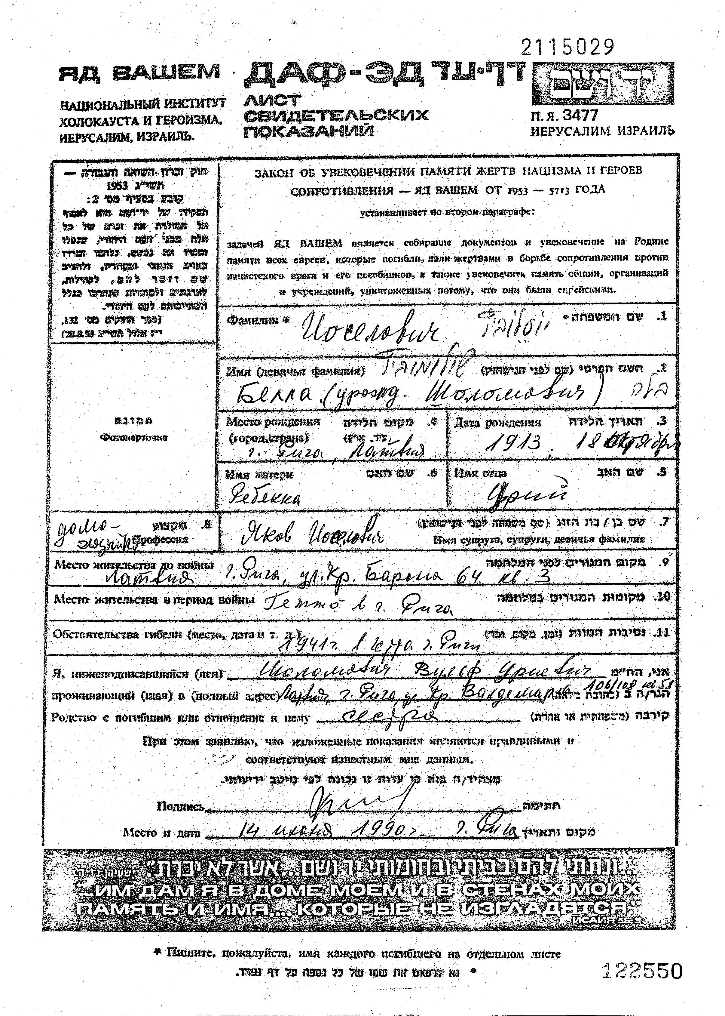 Ioselovich | Bela | 1913 | Riga, Lettland | Gedenkblatt |