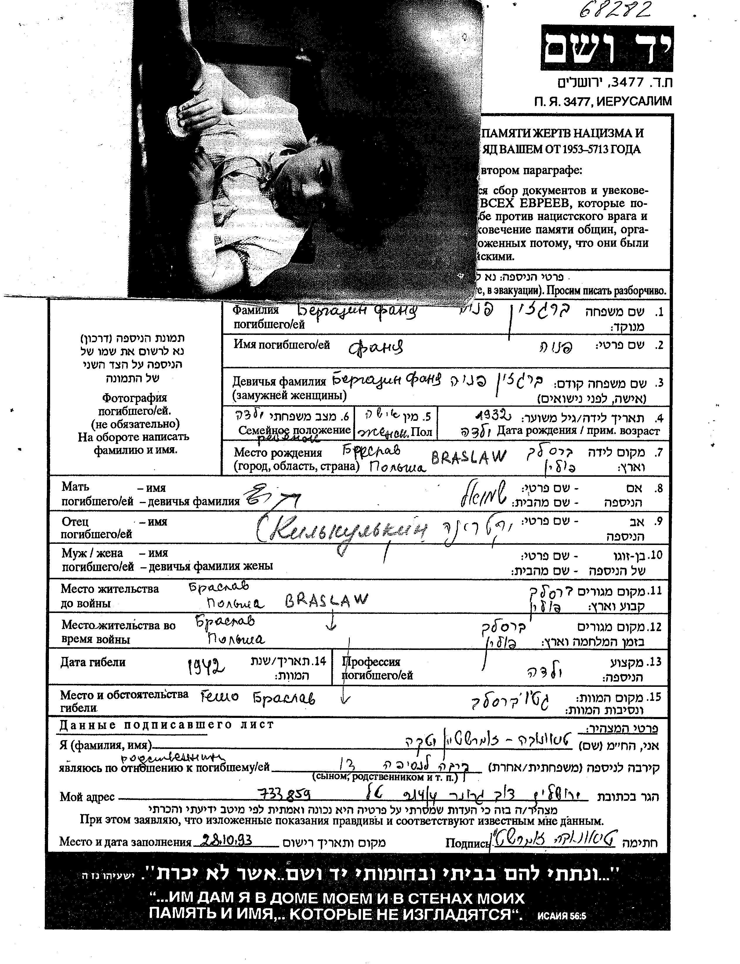 Fania Bergzin wurde im Jahr 1932 in Braslaw, Polen geboren. Vor dem Zweiten Weltkrieg lebte sie in Braslaw, Polen.