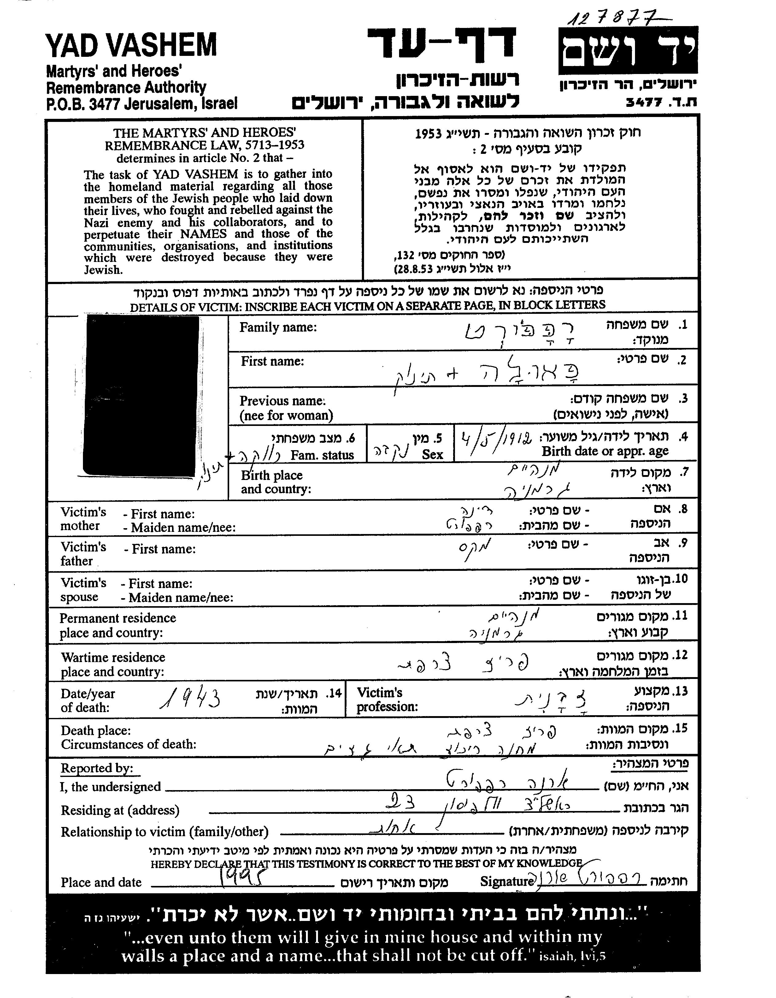 Paula wurde in der Schoah ermordet. Todesort: unbekannter Ort im Jahr 1943.
