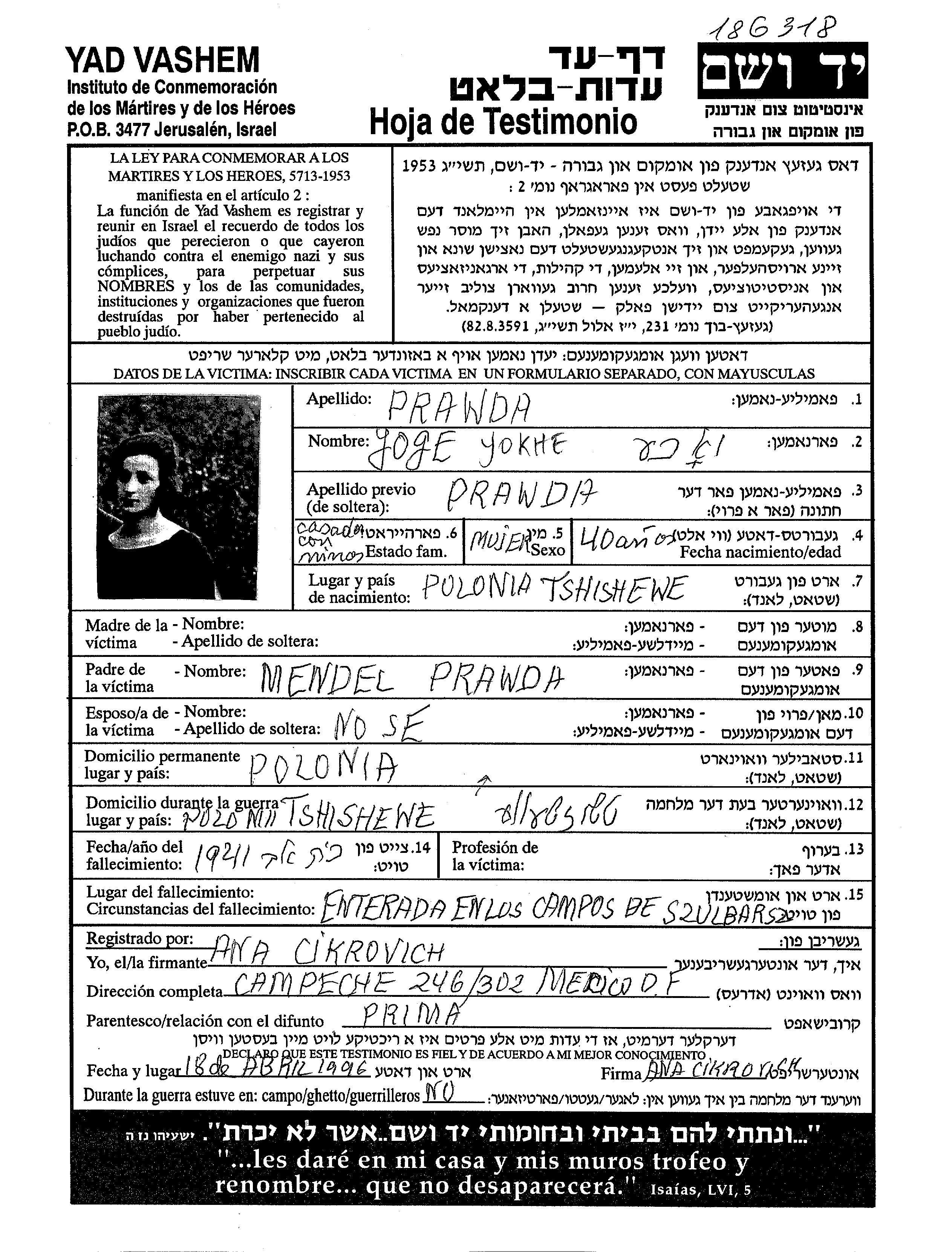 Yokhe Prawda, geb. Prawda wurde im Jahr 1901 in Czyzewo, Polen geboren. Vor dem Zweiten Weltkrieg lebte sie in Czyzewo, Polen.
