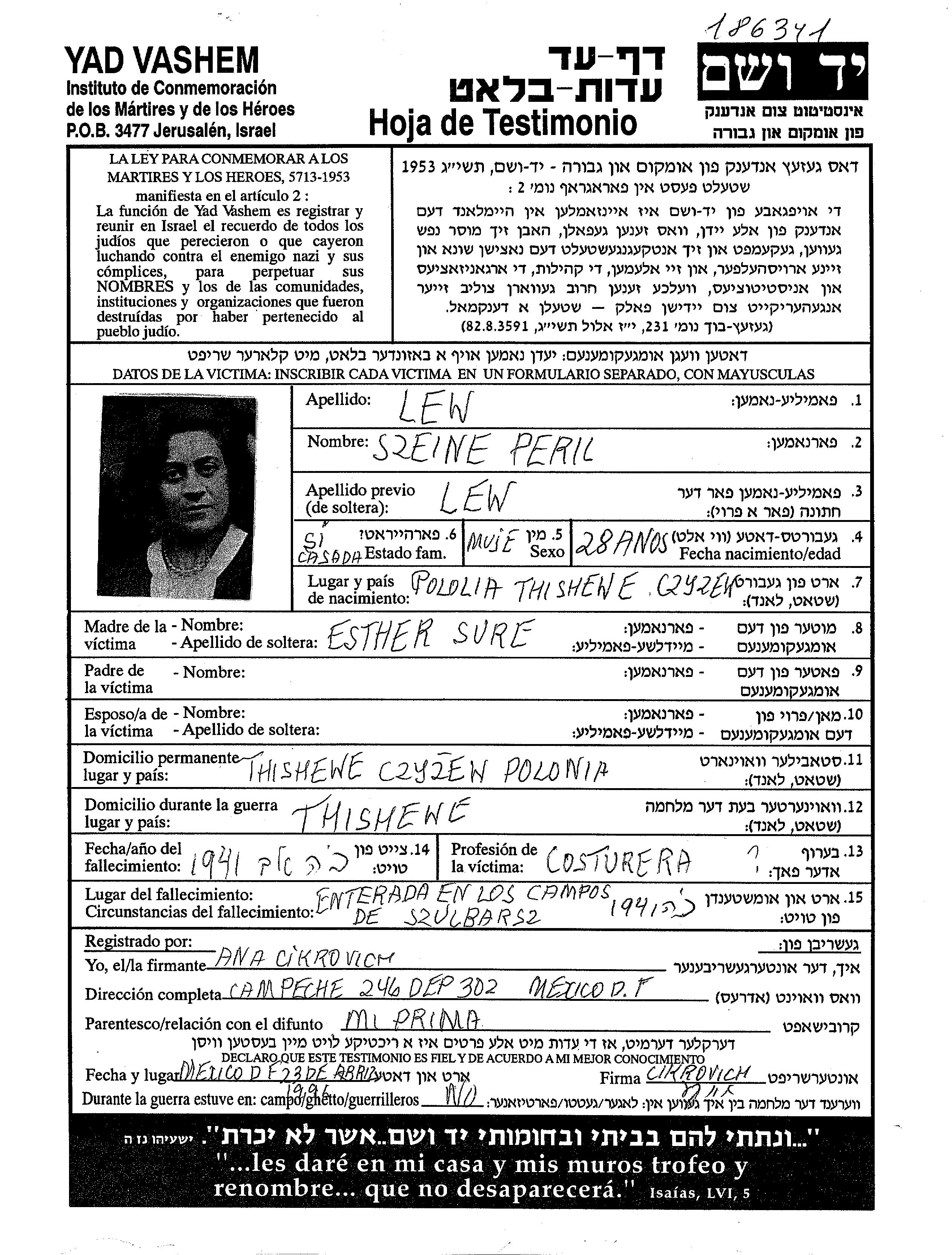 Szeine Peril Lew, geb. Lew wurde im Jahr 1903 in Czyzewo, Polen geboren. Sie war Schneiderin. Vor dem Zweiten Weltkrieg lebte sie in Czyzewo, Polen.