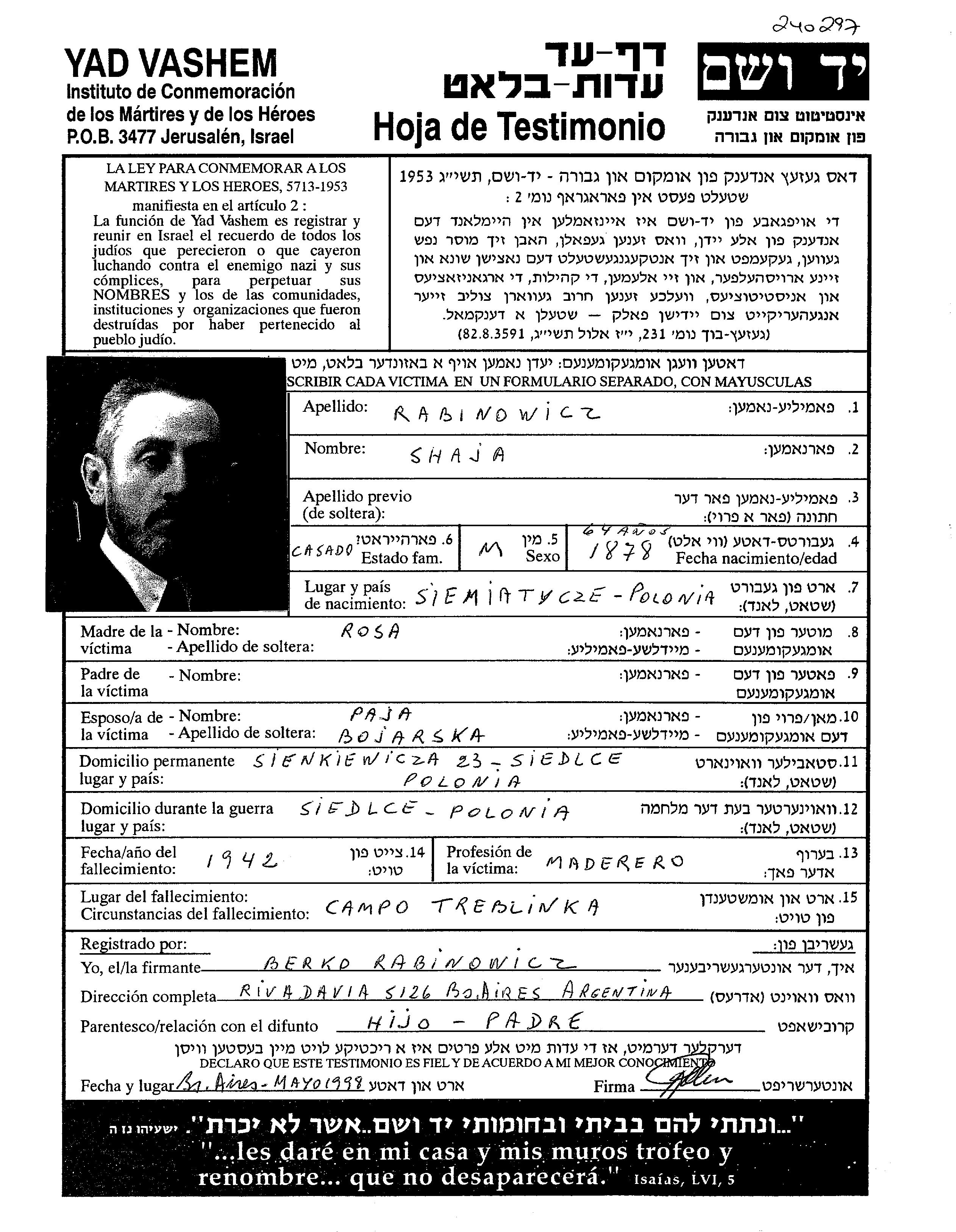 Shaja Rabinowicz wurde im Jahr 1878 in Siemiatycze, Polen geboren. Er war Zimmermann. Vor dem Zweiten Weltkrieg lebte er in Siedlce, Polen.