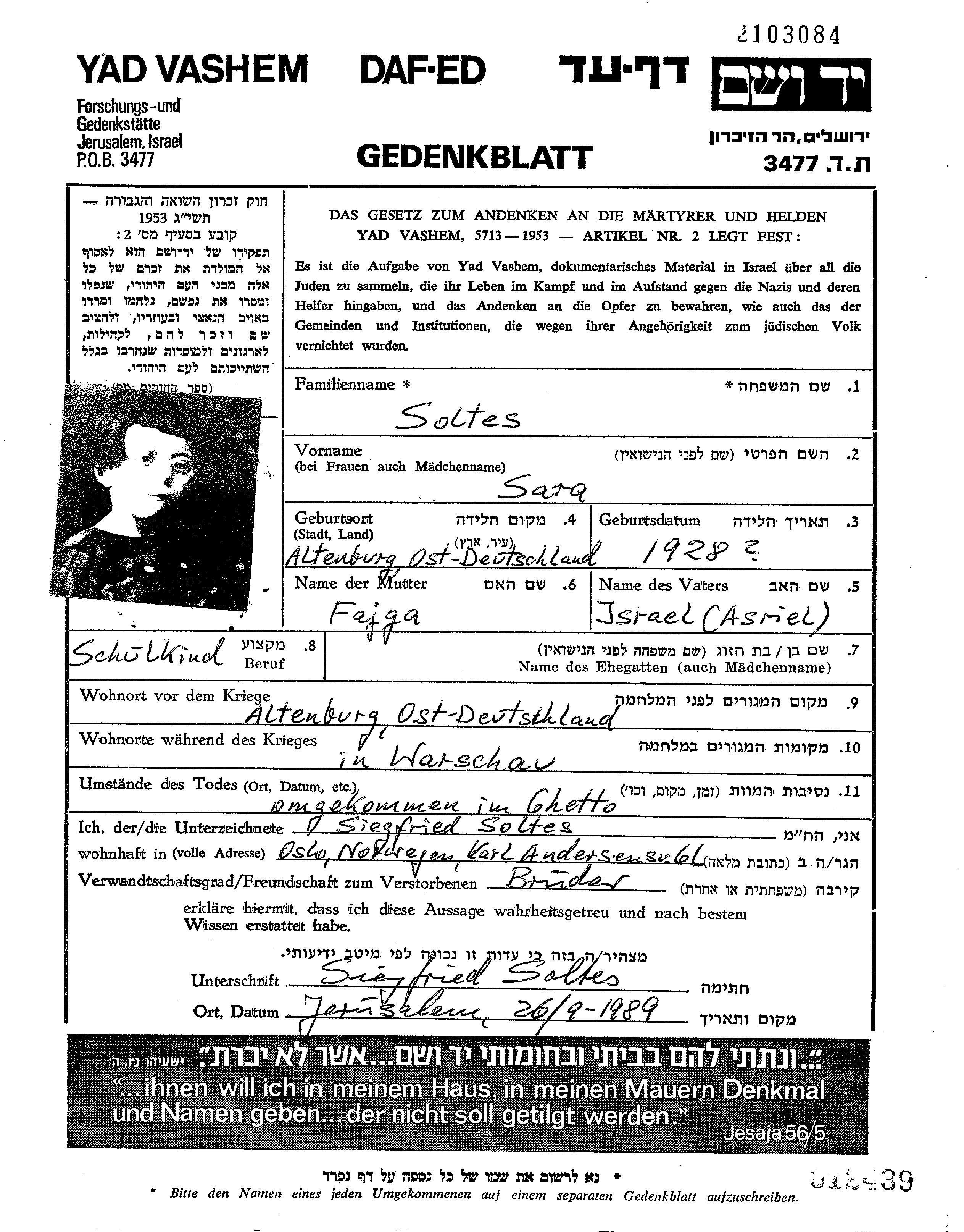 Sara Soltes wurde im Jahr 1928 in Altenburg, Deutsches Reich geboren. Sie war Schüler/-in. Vor dem Zweiten Weltkrieg lebte sie in Altenburg, Deutsches Reich.