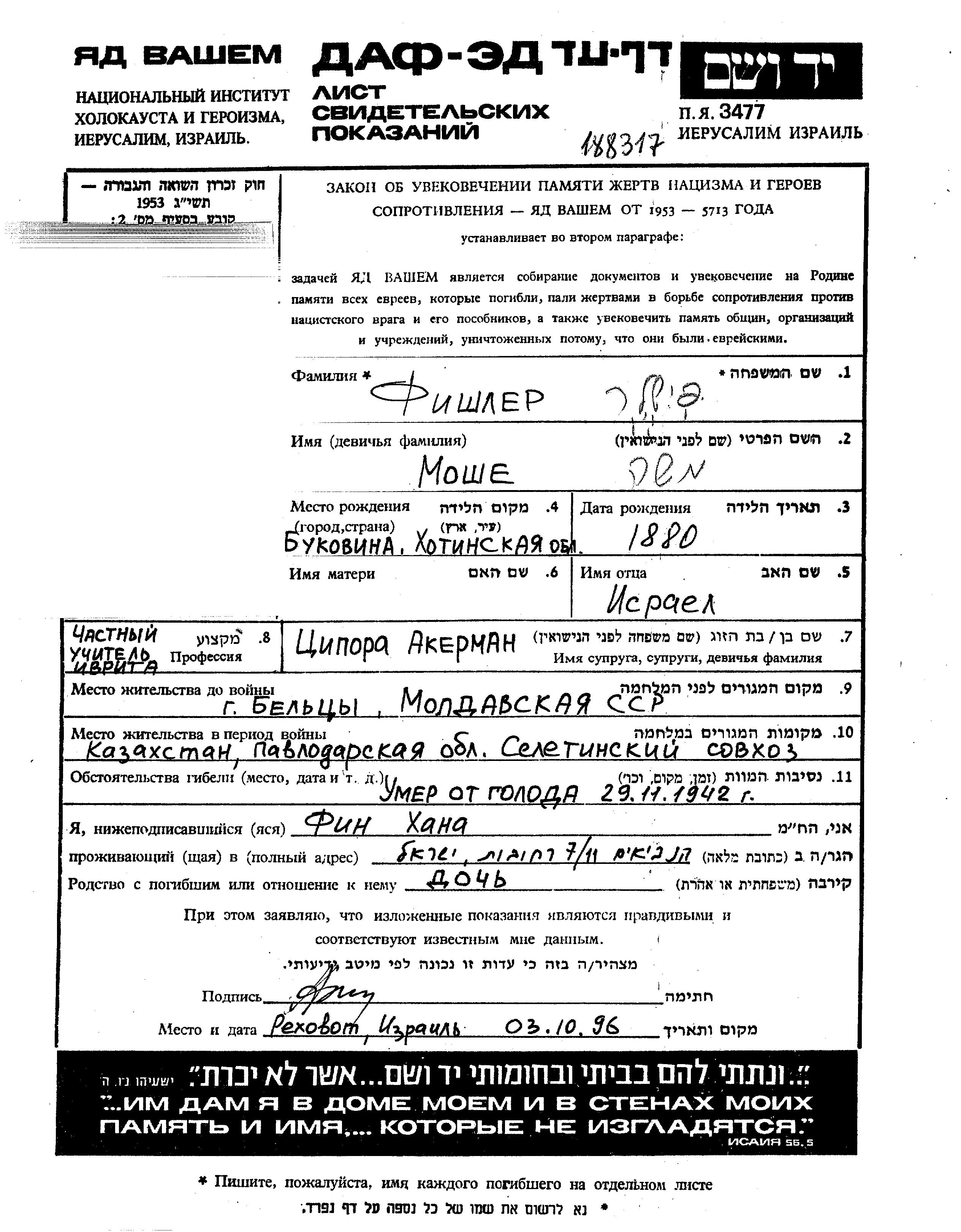 Moshe Fishler wurde im Jahr 1880 in Bukovina, Rumänien geboren. Er war Lehrer/in. Vor dem Zweiten Weltkrieg lebte er in Balti, Rumänien. Moshe wurde in der Zeit zwischen 1933-1945 in indirekter Beziehung mit der Shoah umgekommen. Todesort: Seletinskiy, Kazakhstan (UdSSR) im Jahr 29/11/1942.