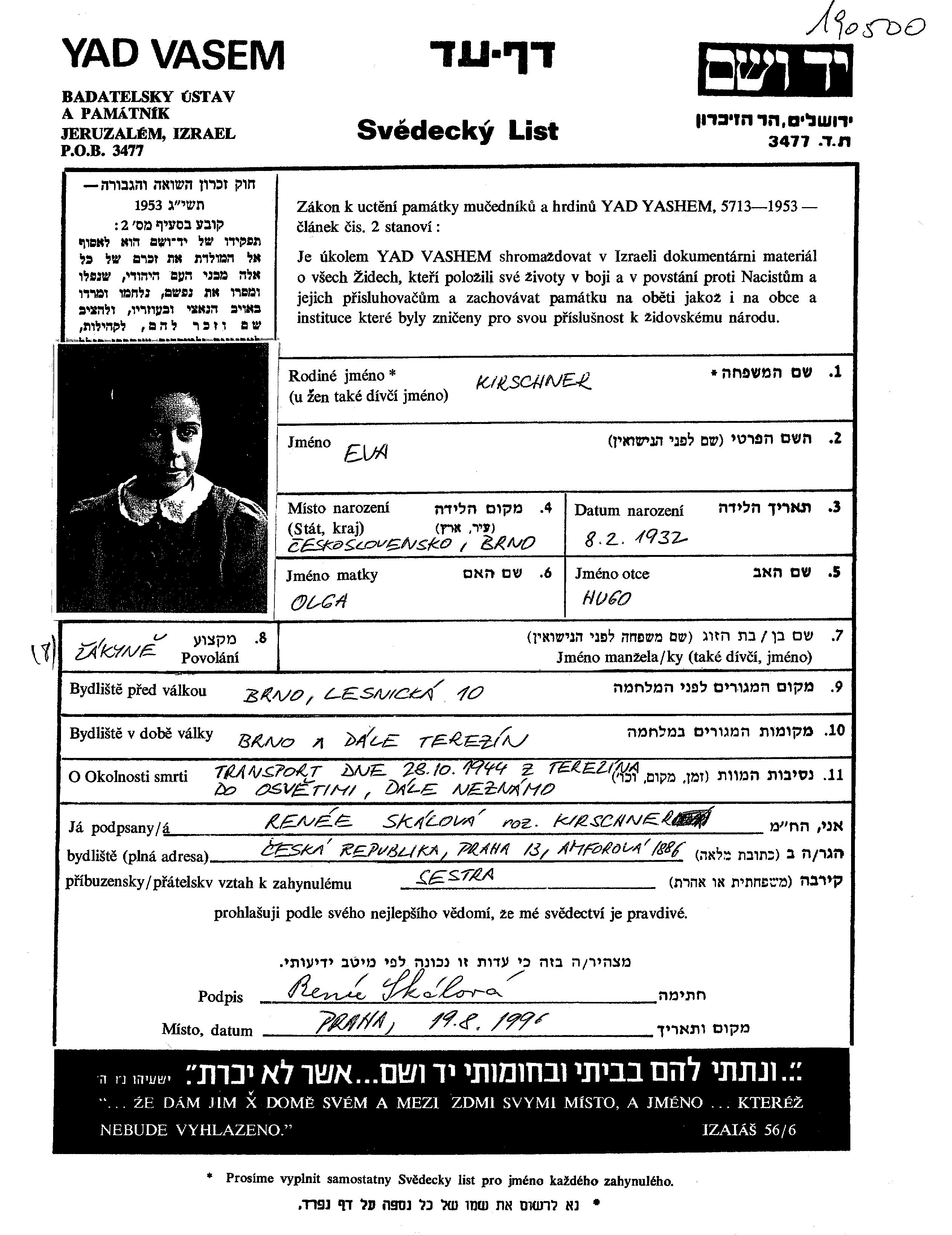 Kirschner Eva 1932 Brno, Tschechoslowakei Gedenkblatt