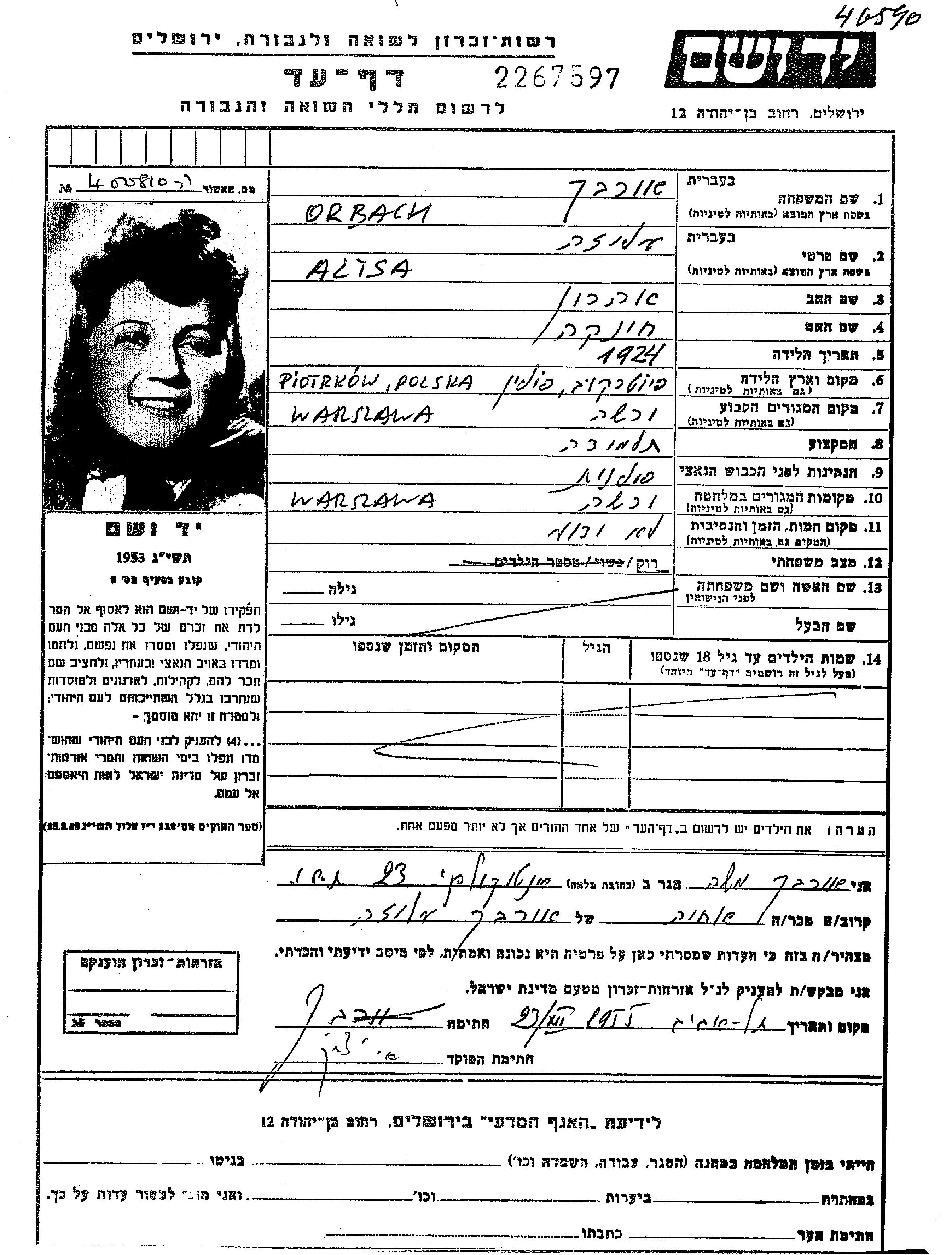 Alisa Aliza Orbach Orbakh wurde im Jahr 1924 in Piotrkow Kujawski, Polen geboren. Sie war Schüler/-in. Vor dem Zweiten Weltkrieg lebte sie in Warszawa, Polen.