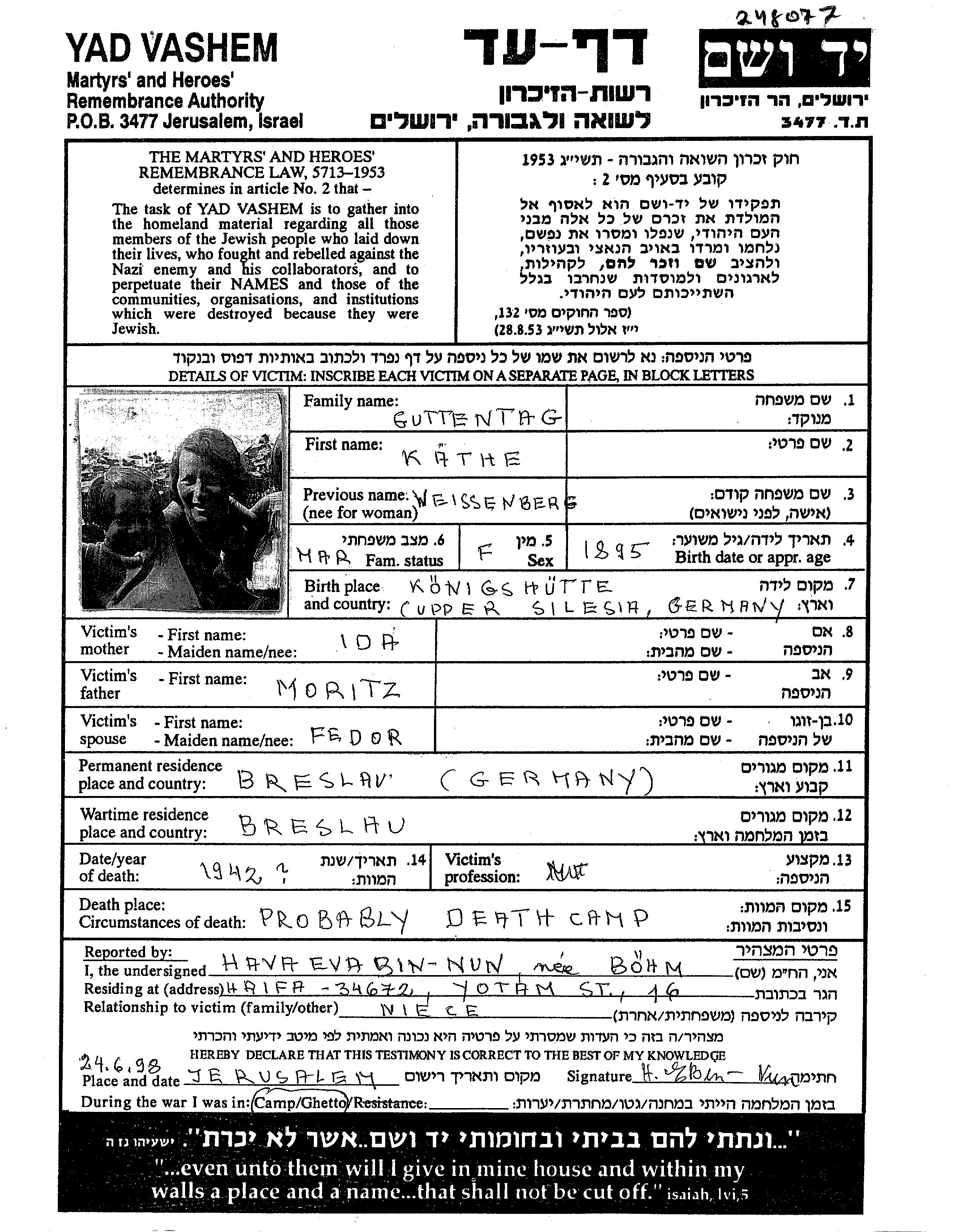 Guttentag | Käthe | 1895 | Breslau, Deutsches Reich | Gedenkblatt |