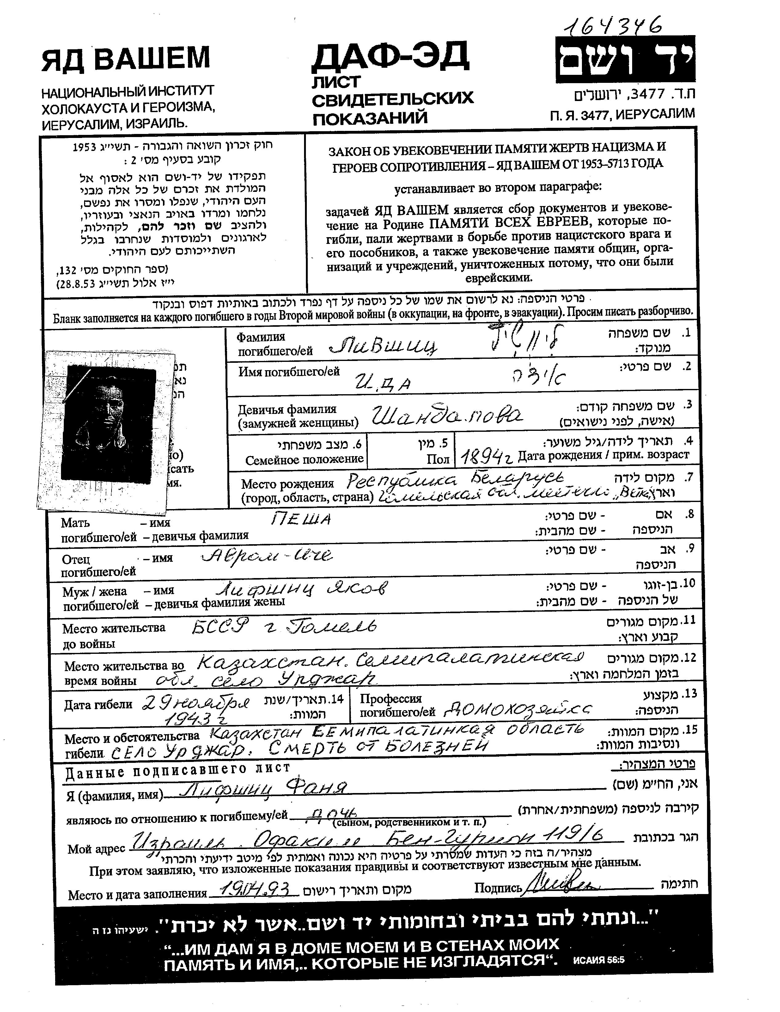 Ida Livshitz, geb. Shandalov wurde im Jahr 1894 in Vetka, Weißrussland (UdSSR) geboren. Sie war Hausfrau. Vor dem Zweiten Weltkrieg lebte sie in Gomel, Weißrussland (UdSSR). Ida wurde in der Zeit zwischen 1933-1945 in indirekter Beziehung mit der Shoah umgekommen. Todesort: Urdzhar, Kazakhstan (UdSSR) im Jahr 29/11/1943.