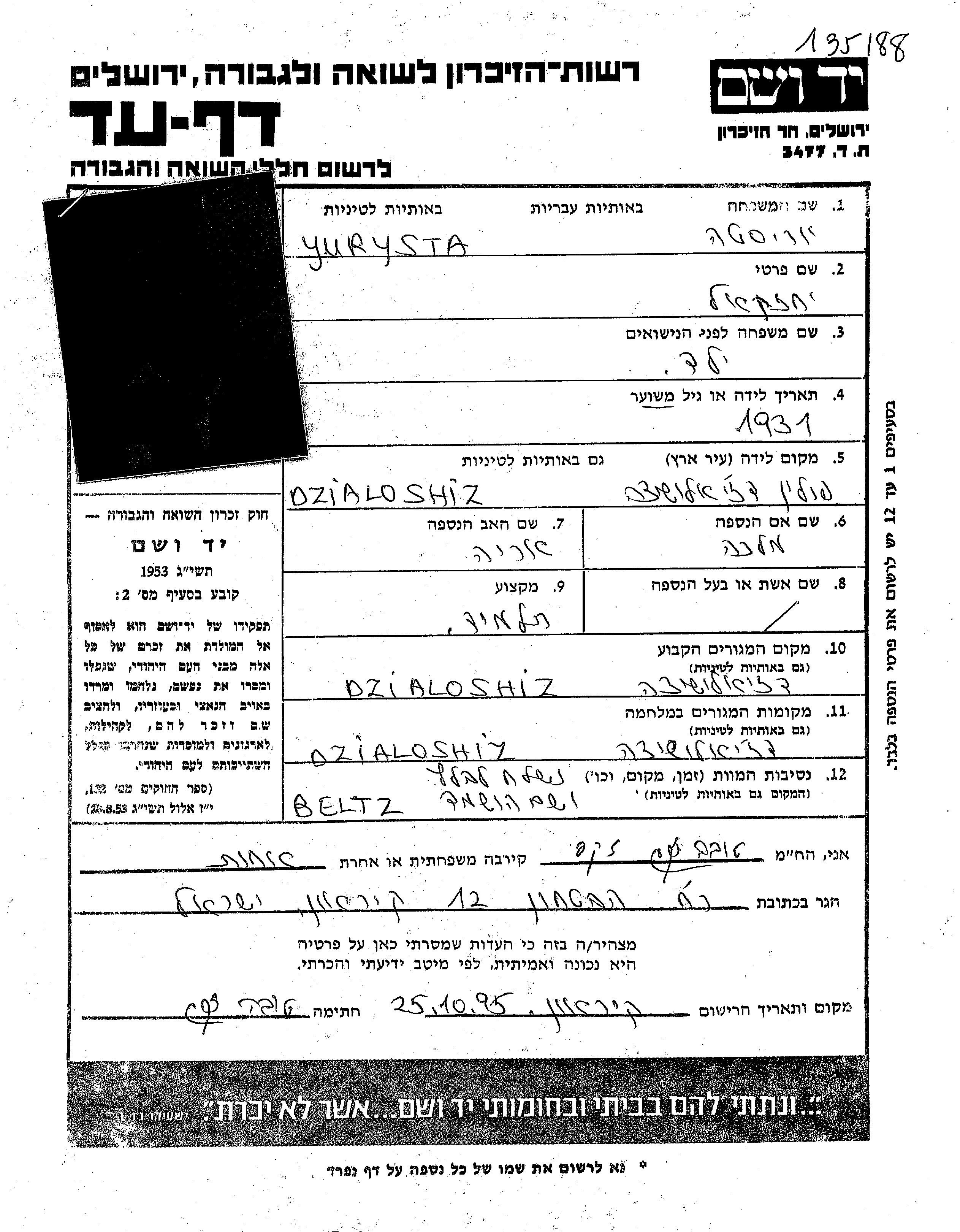 Yechaskel Jurysta wurde im Jahr 1931 in Dzialoszyce, Polen geboren. Er war Schüler/-in. Vor dem Zweiten Weltkrieg lebte er in Dzialoszyce, Polen.