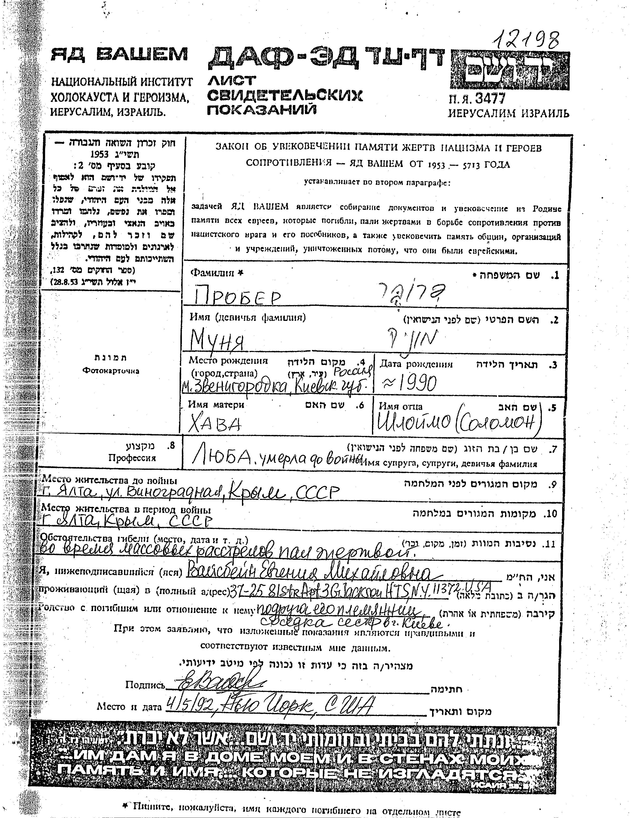 Monia Prober wurde im Jahr 1890 in Zvenigorodka, Ukraine (UdSSR) geboren. Er war der Sohn von Shloimo und Khava. Er war mit Liuba Verwitwet. Vor dem Zweiten Weltkrieg lebte er in Yalta, Russland (UdSSR). Während des Krieges war er in Yalta, Russland (UdSSR).