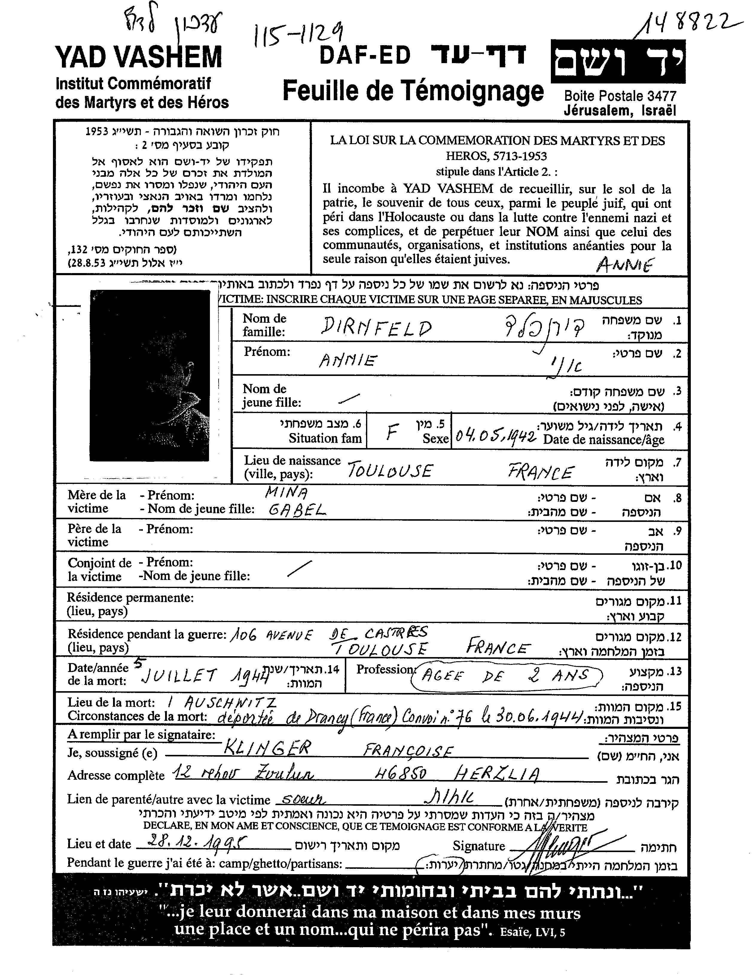 Annie wurde in der Schoah ermordet. Todesort: Auschwitz, Polen im Jahr 05/07/1944.