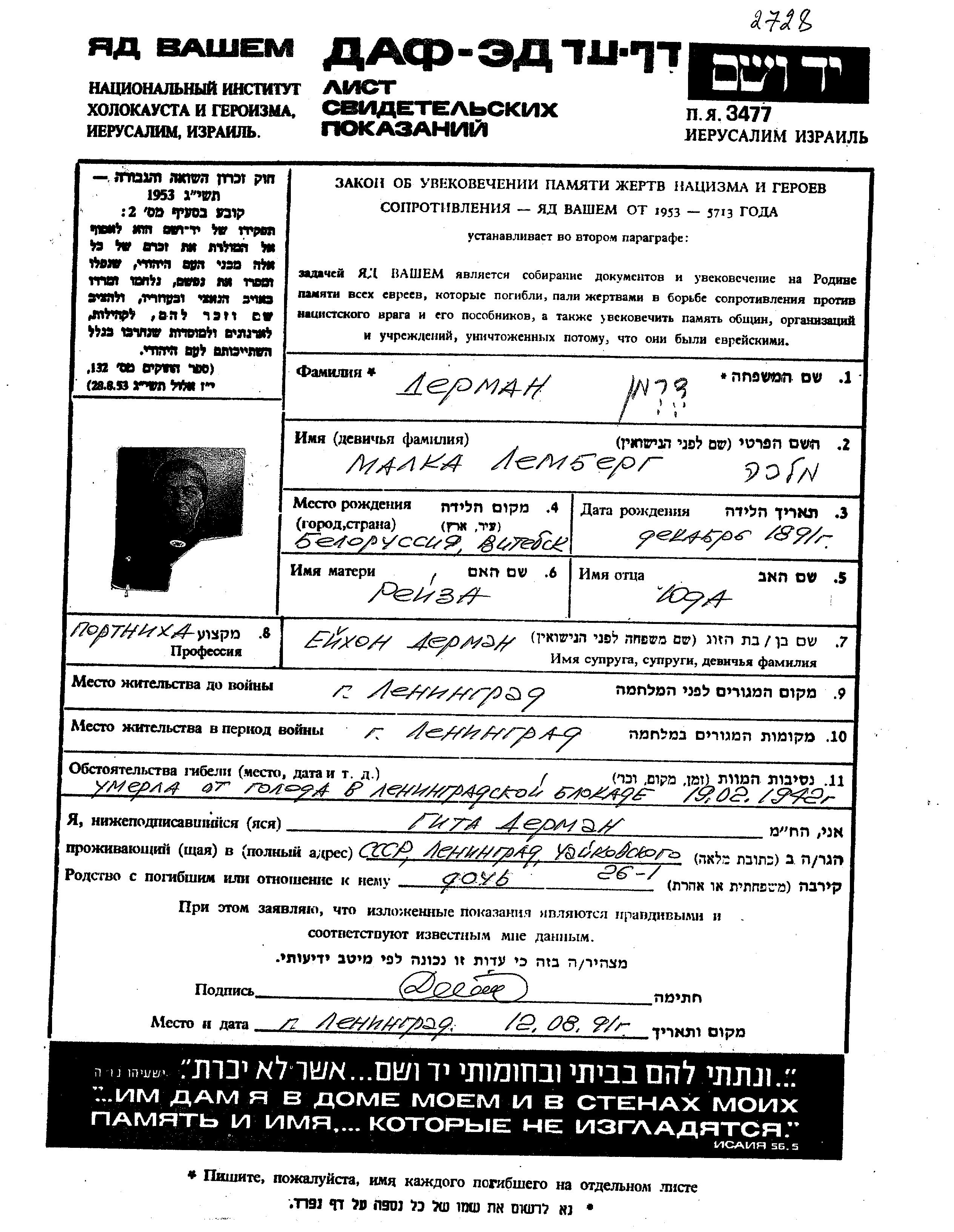 Malka Derman Man, geb. Lemberg wurde im Jahr 1891 in Vitebsk, Weißrussland (UdSSR) geboren. Sie war Schneider. Vor dem Zweiten Weltkrieg lebte sie in Leningrad, Russland (UdSSR).