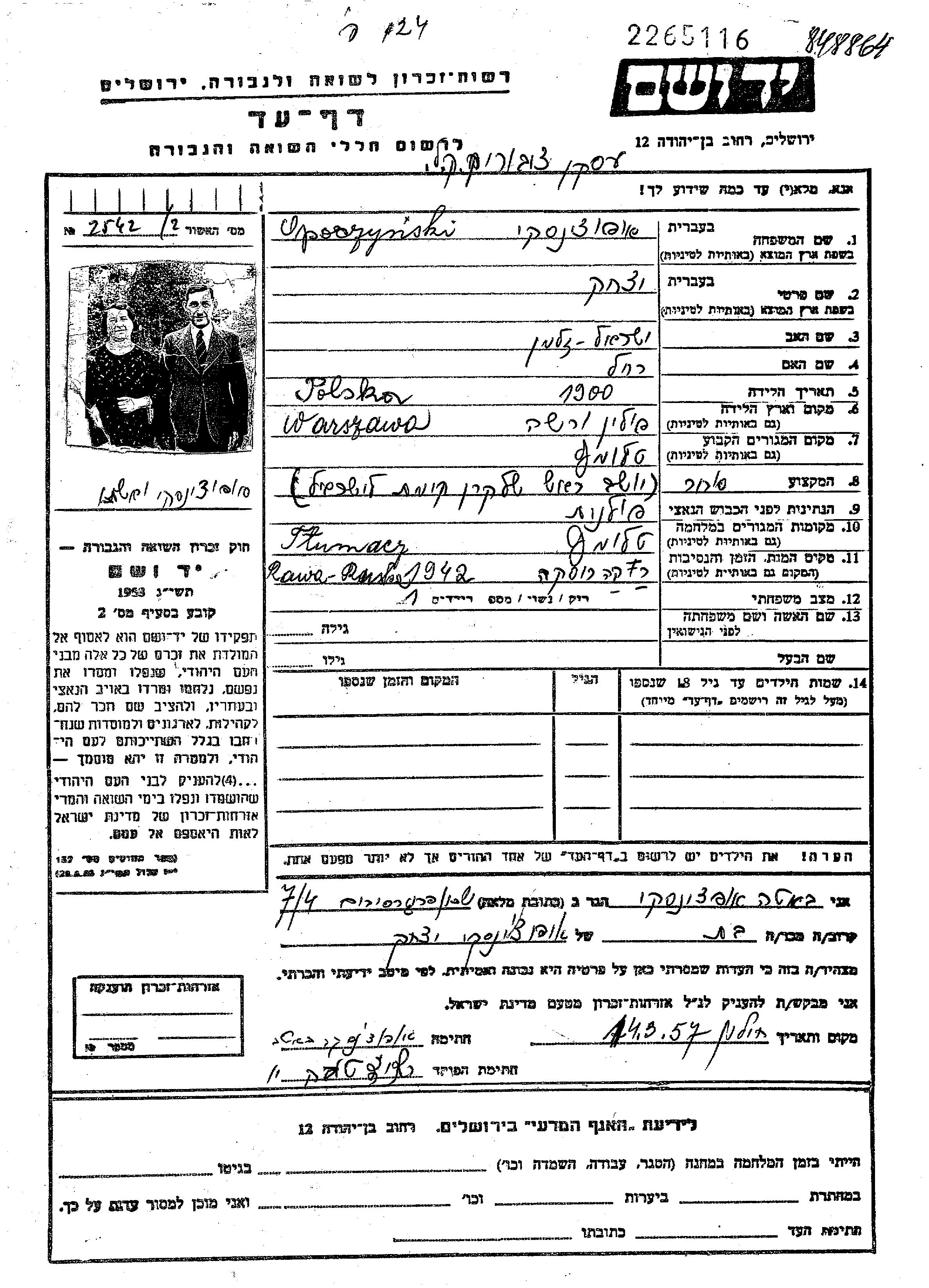 Ytzkhak Opoczynski wurde im Jahr 1900 in Lwow, Polen geboren. Er war Kaufmann/-frau. Vor dem Zweiten Weltkrieg lebte er in Tlumacz, Polen.