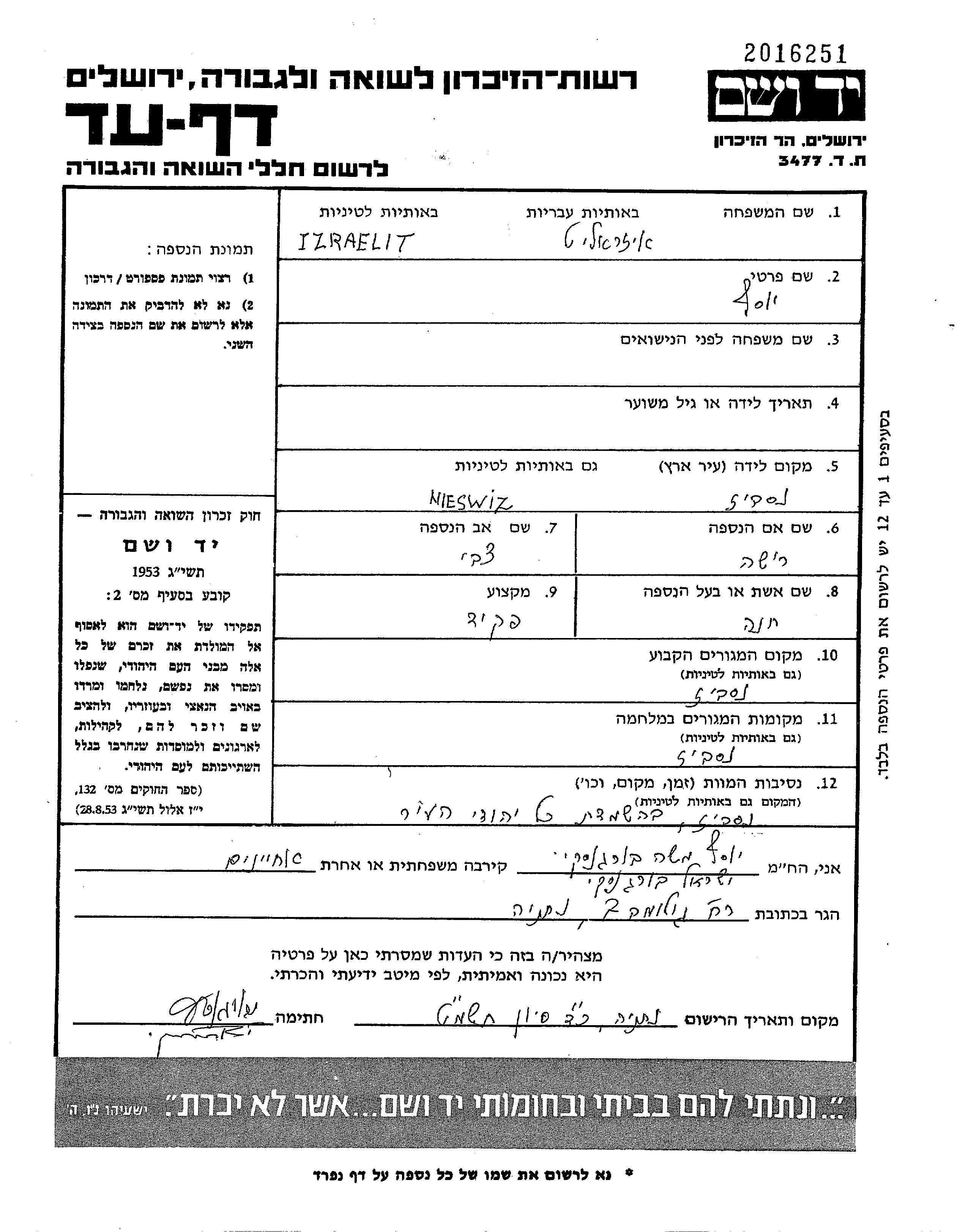 Izraelit Yosef Nieśwież, Polen Gedenkblatt