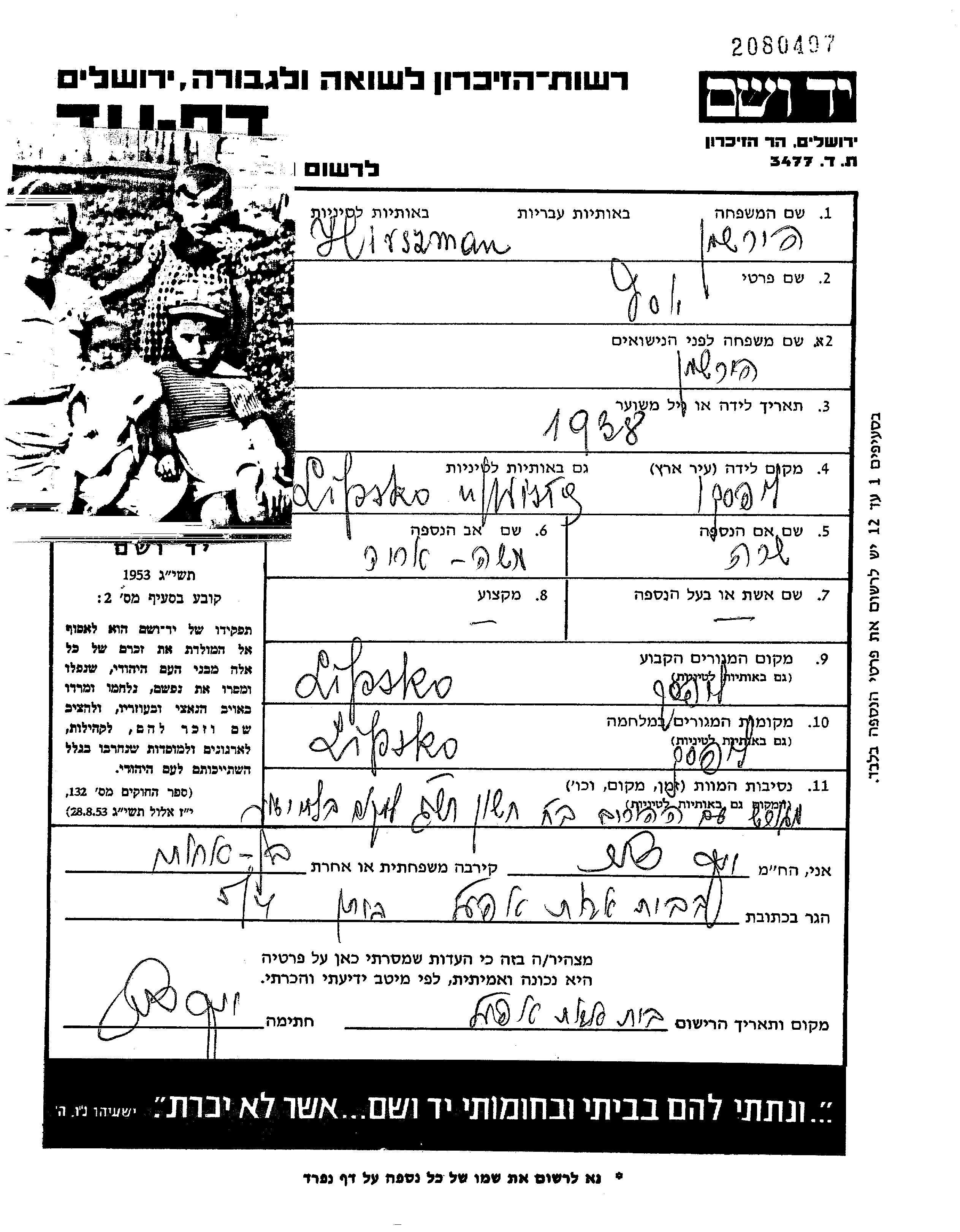 Yosef Hirszman wurde im Jahr 1938 in Lipsko, Polen geboren. Vor dem Zweiten Weltkrieg lebte er in Lipsko, Polen. Yosef wurde in der Schoah ermordet. Todesort: unbekannter Ort.