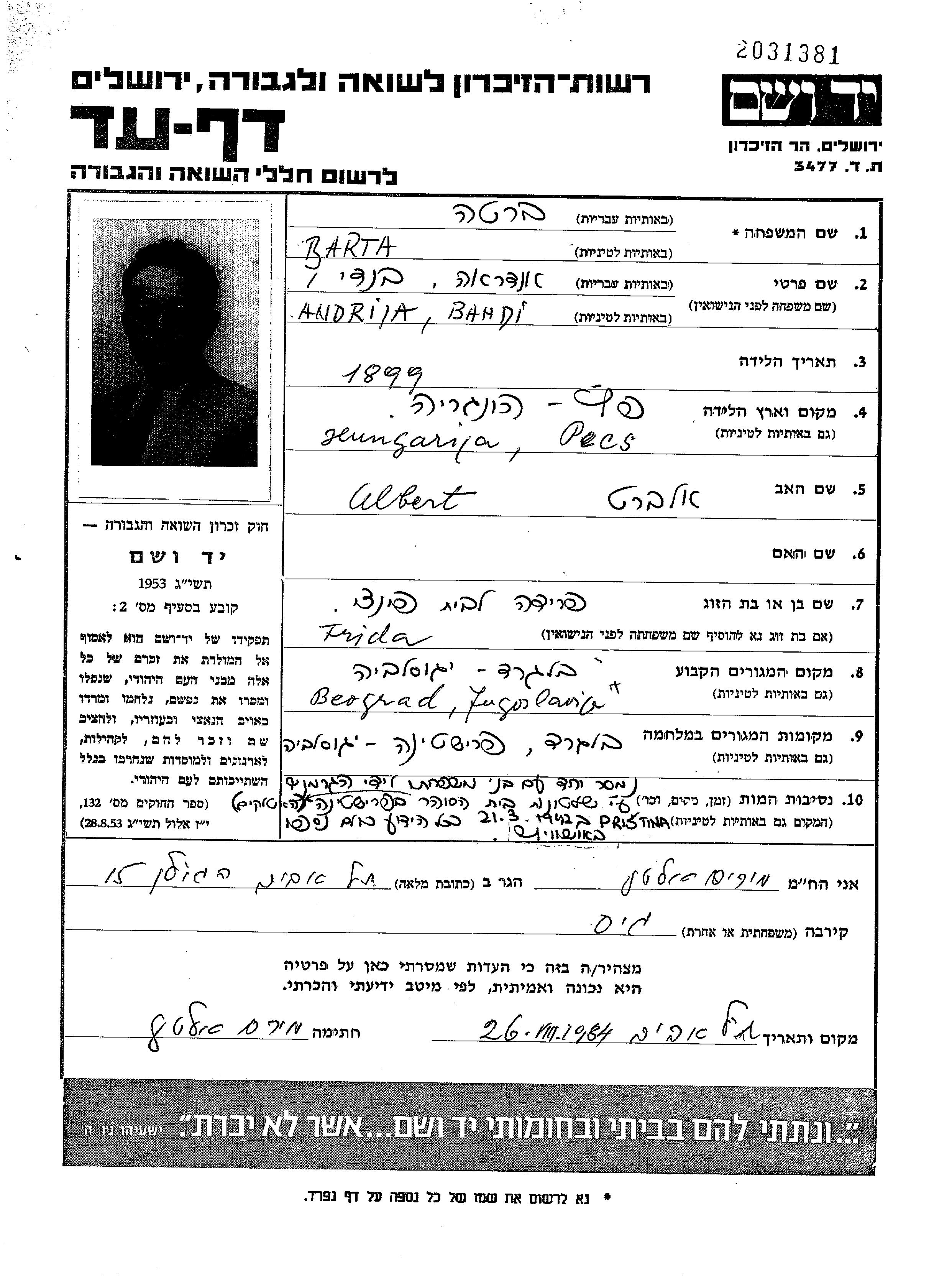 Andrija Barta wurde im Jahr 1899 in Pecs, Ungarn geboren. Er war Ingenieur. Vor dem Zweiten Weltkrieg lebte er in Beograd, Jugoslawien.
