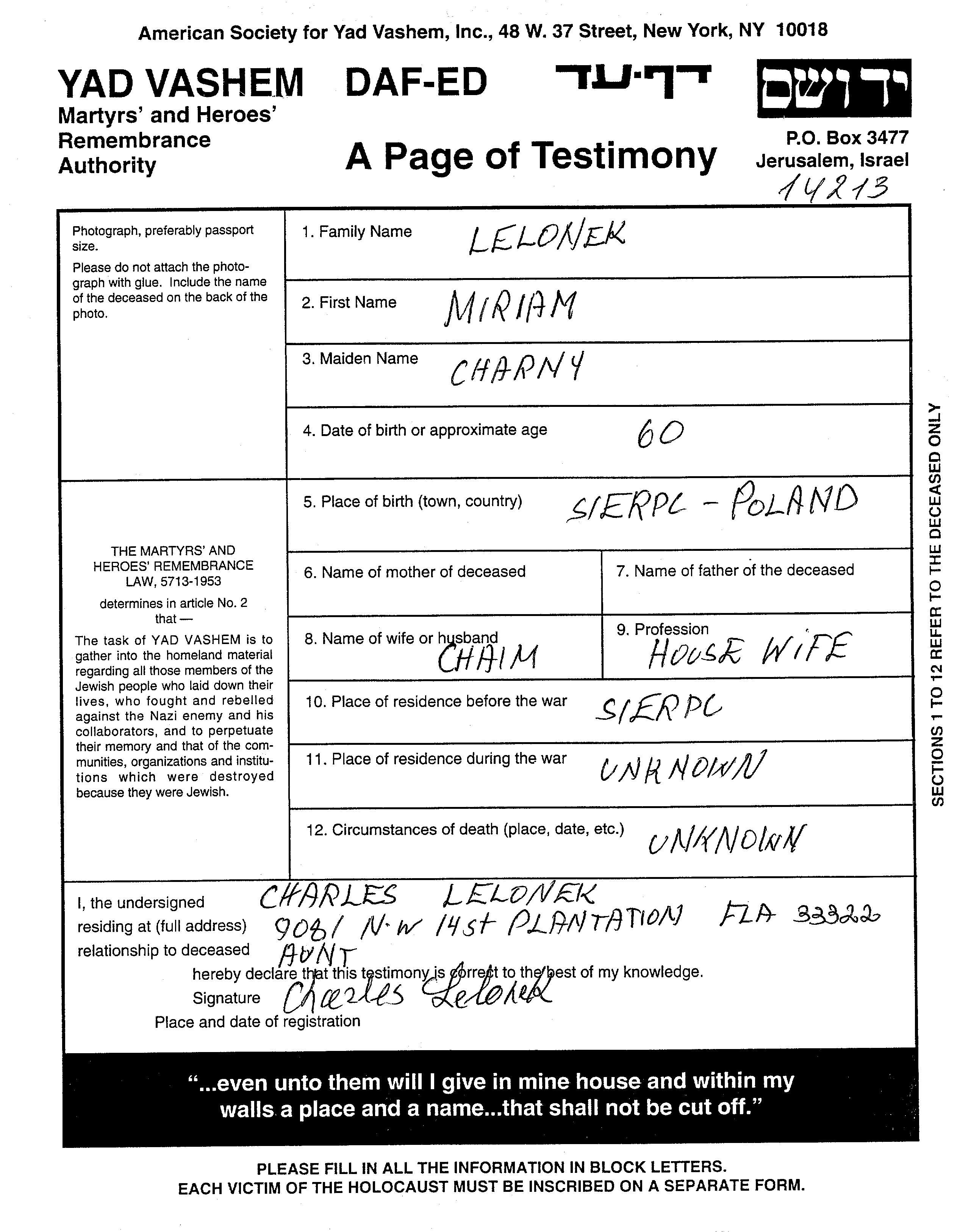Miriam Lelonek, geb. Charny wurde in Sierpc, Polen geboren. Sie war Hausfrau und mit Chaim Verheiratet. Vor dem Zweiten Weltkrieg lebte sie in Sierpc, Polen.