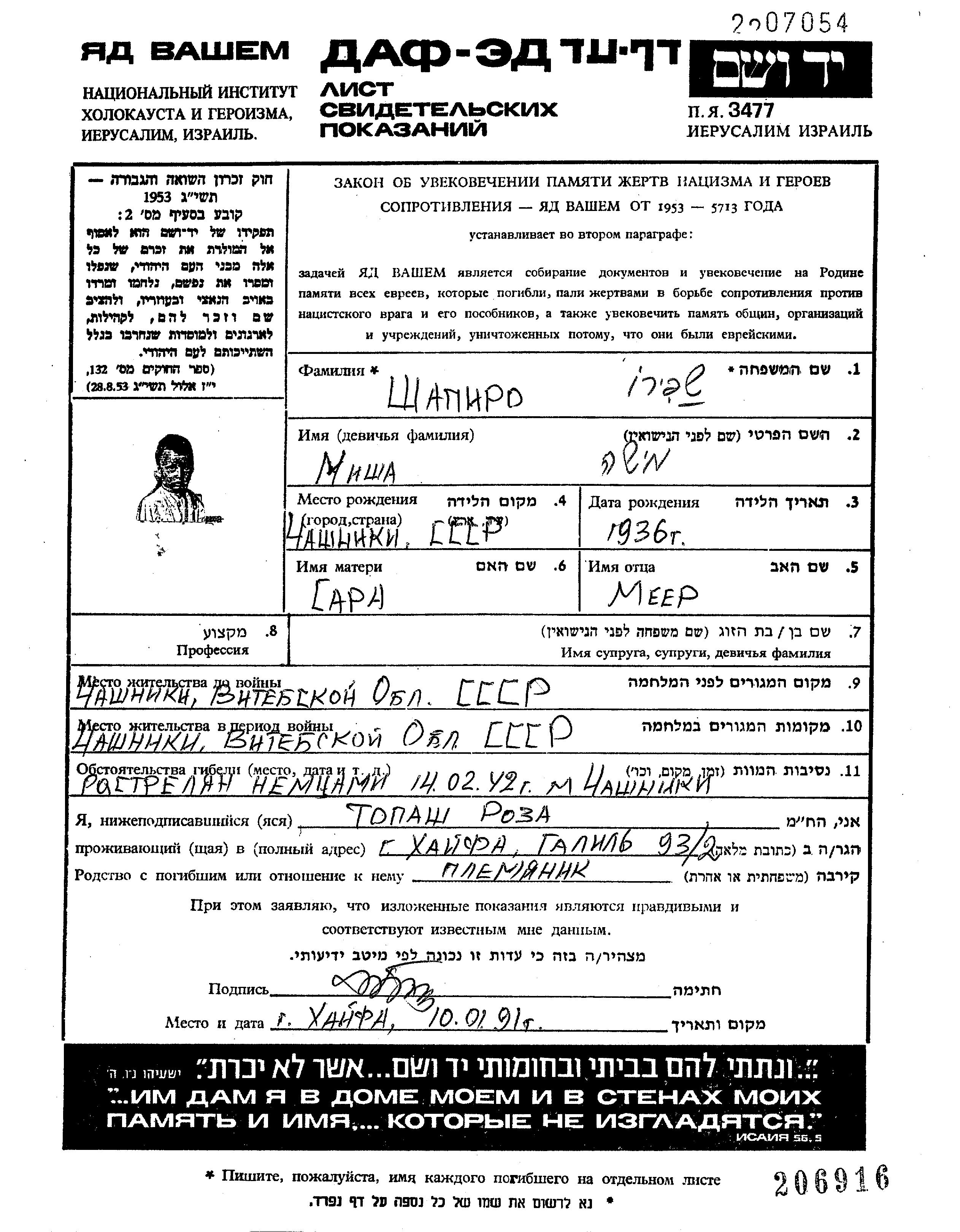Misha Shapiro wurde in Chashniki, Weißrussland (UdSSR) geboren. Vor dem Zweiten Weltkrieg lebte er in Chashniki, Weißrussland (UdSSR).