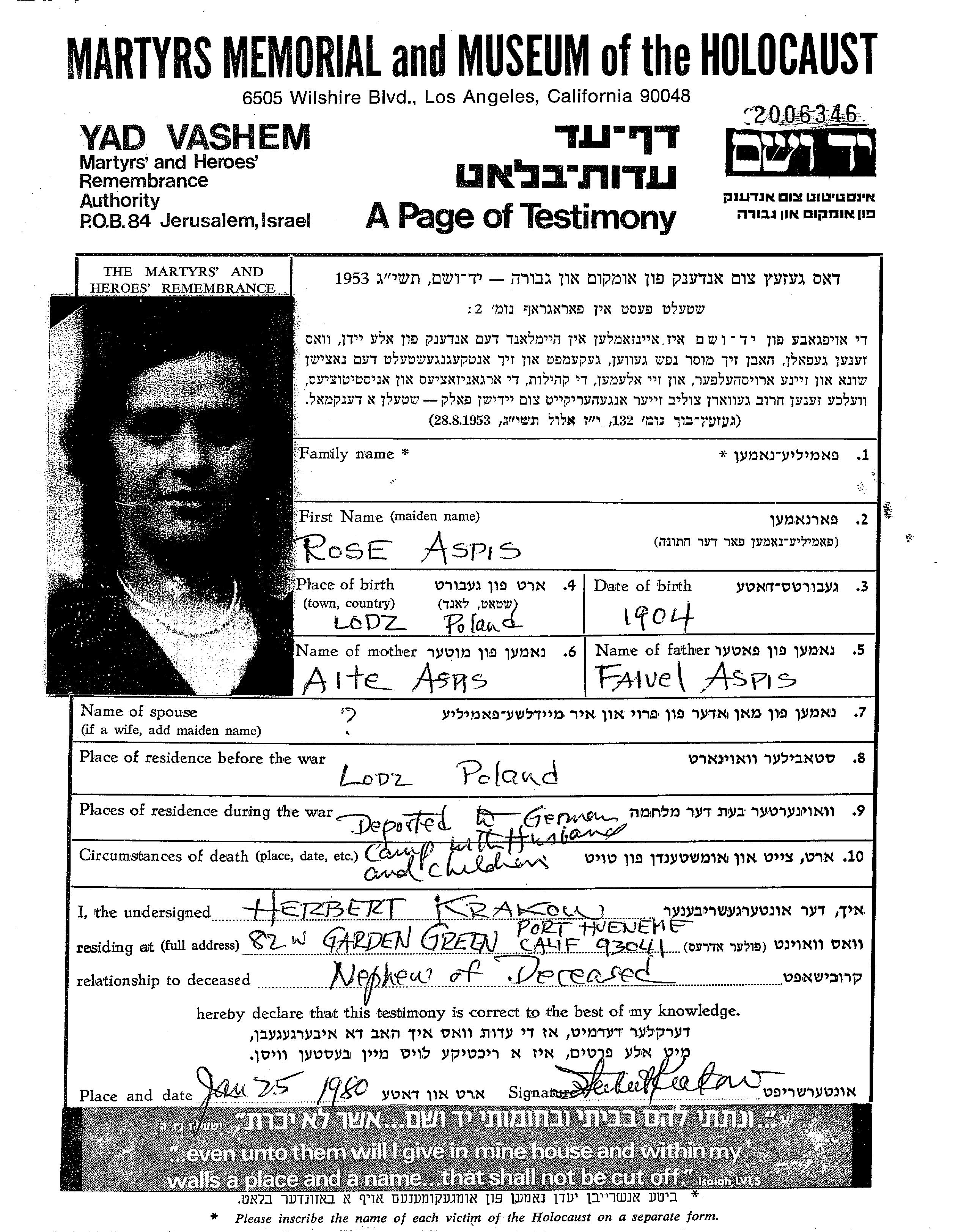 Roza Aspis wurde im Jahr 1904 in Łódź, Polen geboren. Vor dem Zweiten Weltkrieg lebte sie in Łódź, Polen.