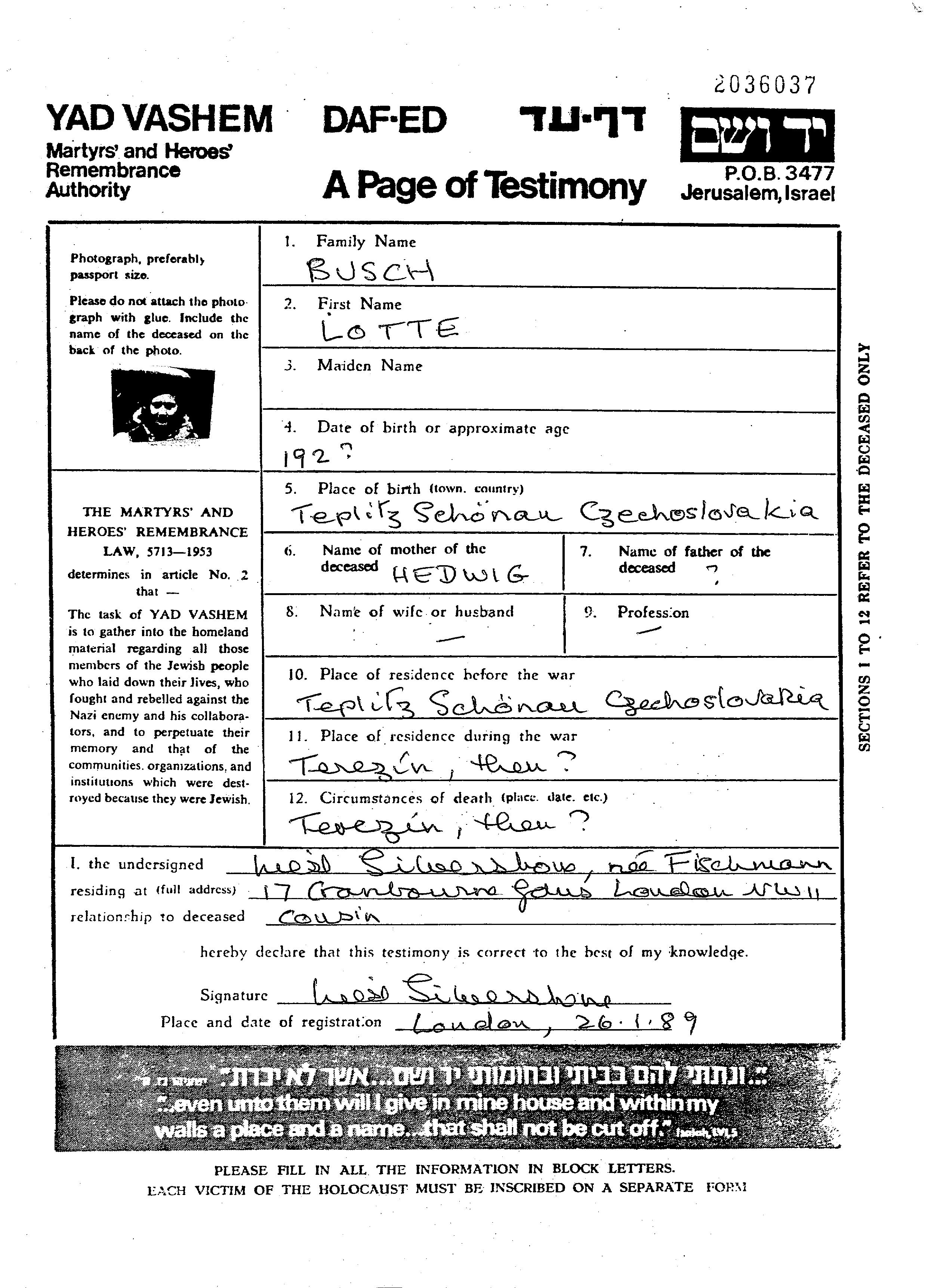 Lotte Busch wurde im Jahr 1922 in Teplitz, Tschechoslowakei geboren. Vor dem Zweiten Weltkrieg lebte sie in Teplitz, Tschechoslowakei.
