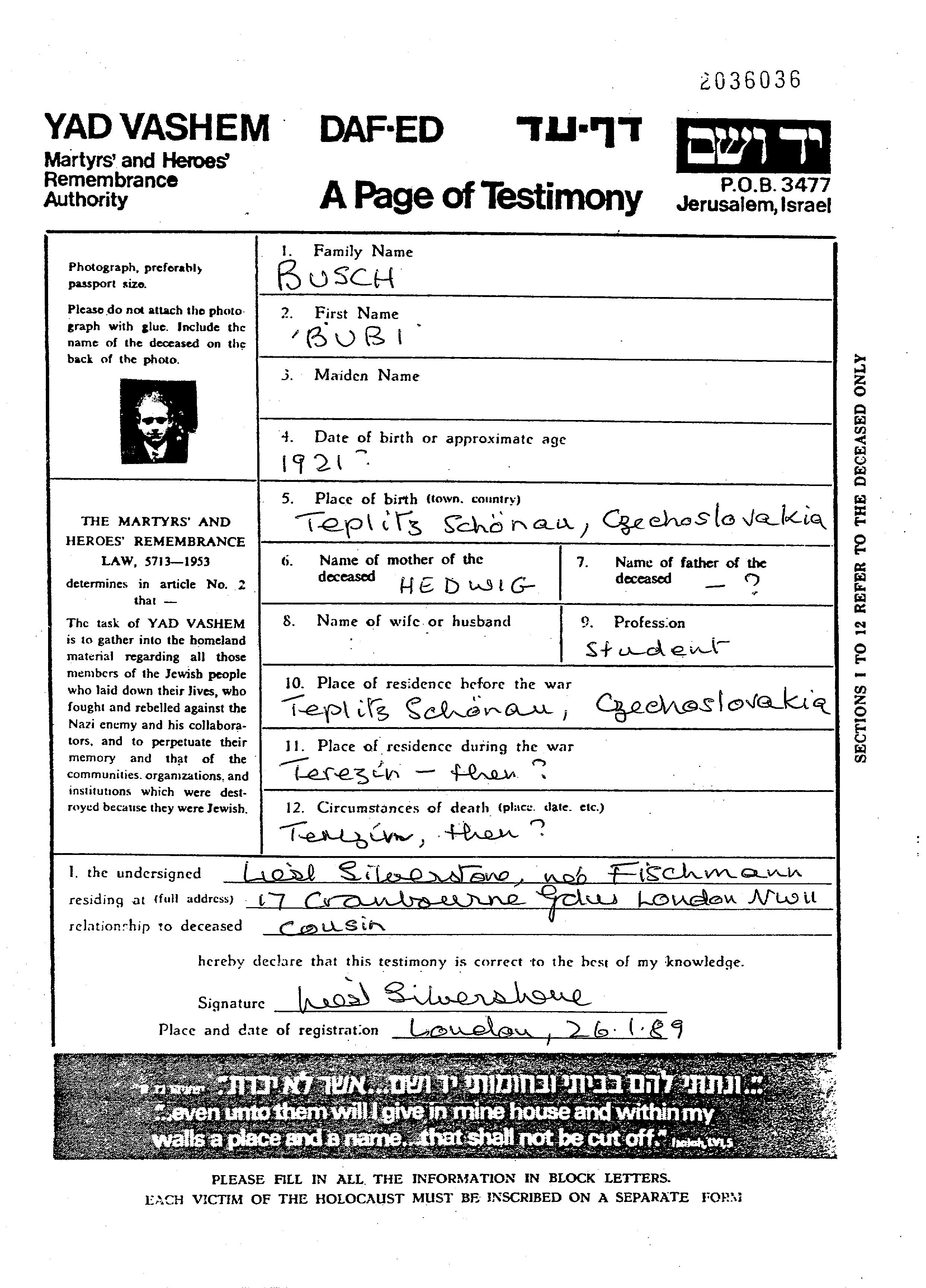 Bubi Busch wurde im Jahr 1921 in Teplitz, Tschechoslowakei geboren. Er war Student. Vor dem Zweiten Weltkrieg lebte er in Teplitz, Tschechoslowakei.