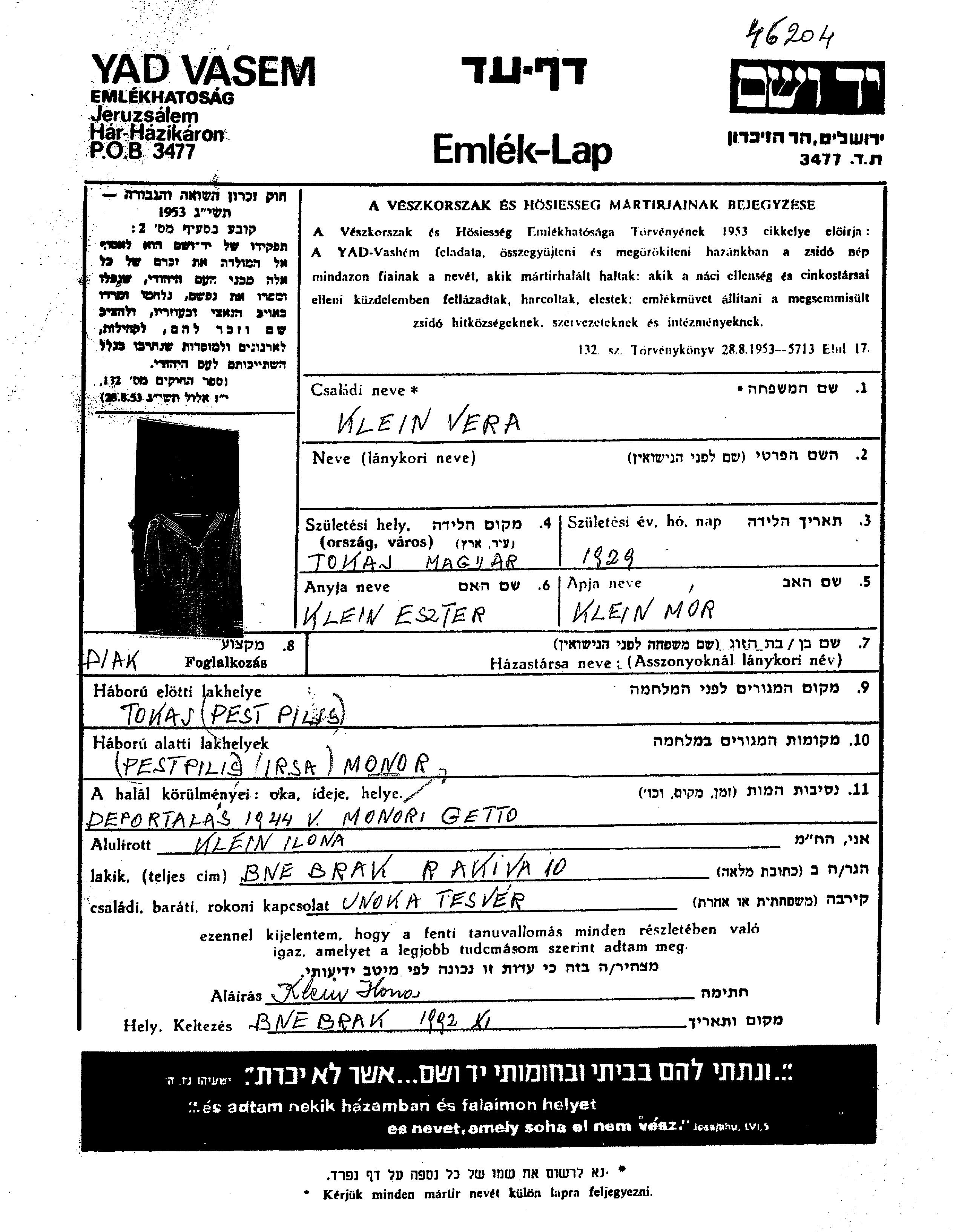 Vera Klein wurde im Jahr 1929 in Tokaj, Ungarn geboren. Sie war Schüler/-in. Vor dem Zweiten Weltkrieg lebte sie in Tokaj, Ungarn.